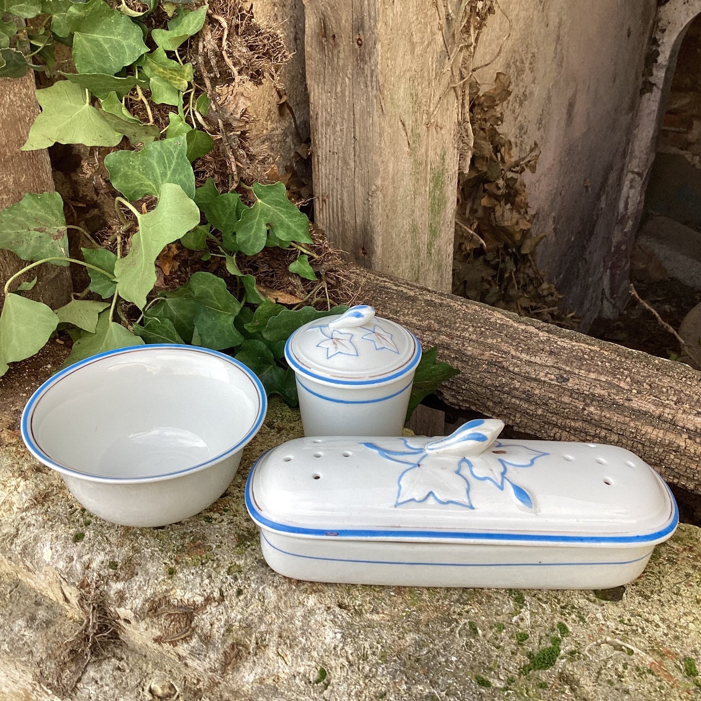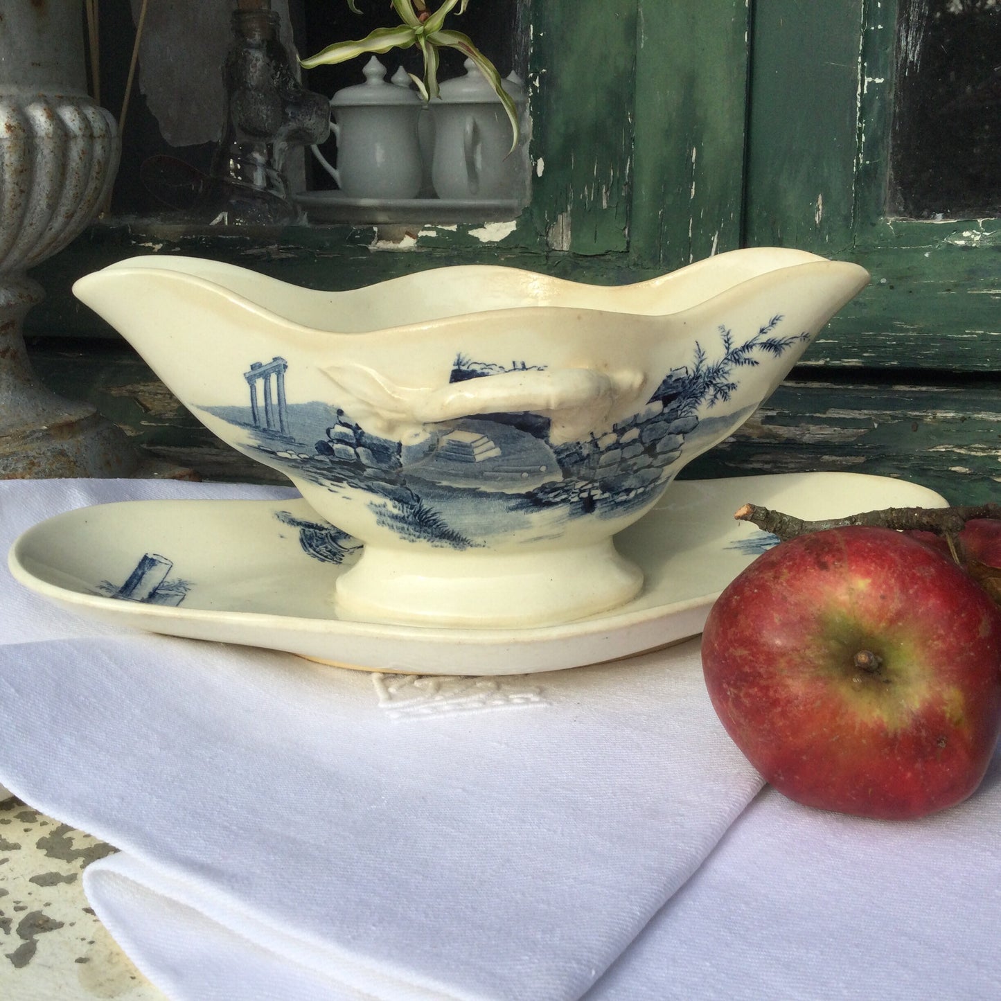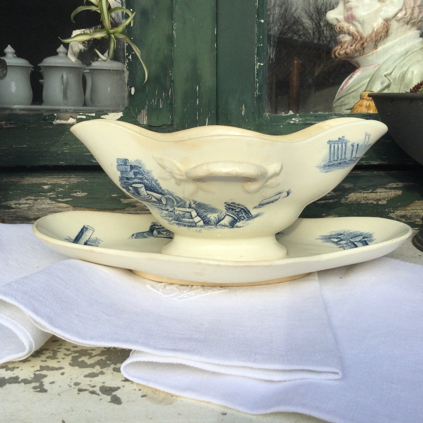 Add Antique gravy boat blue and white sauce bowl Gien faïence Ruins ceramic serving bowl with saucer French country chic decor to the cart