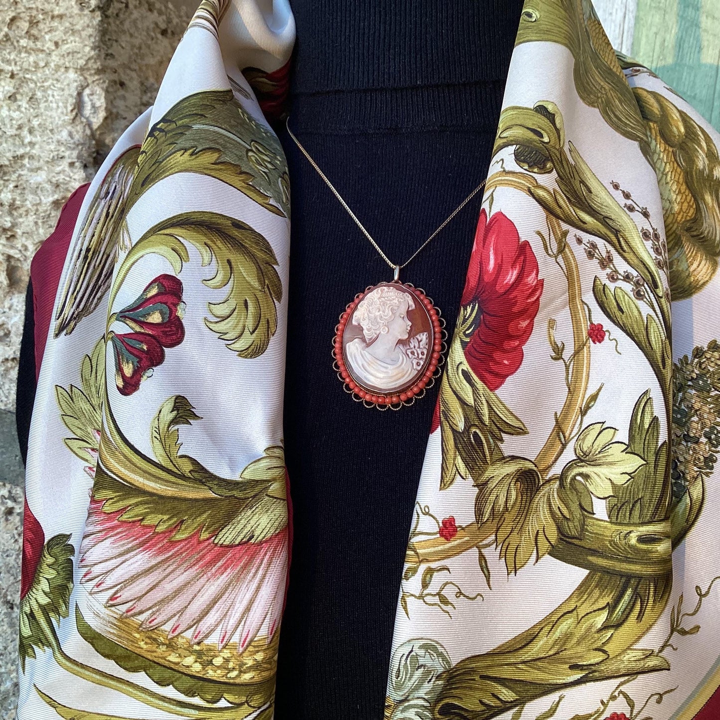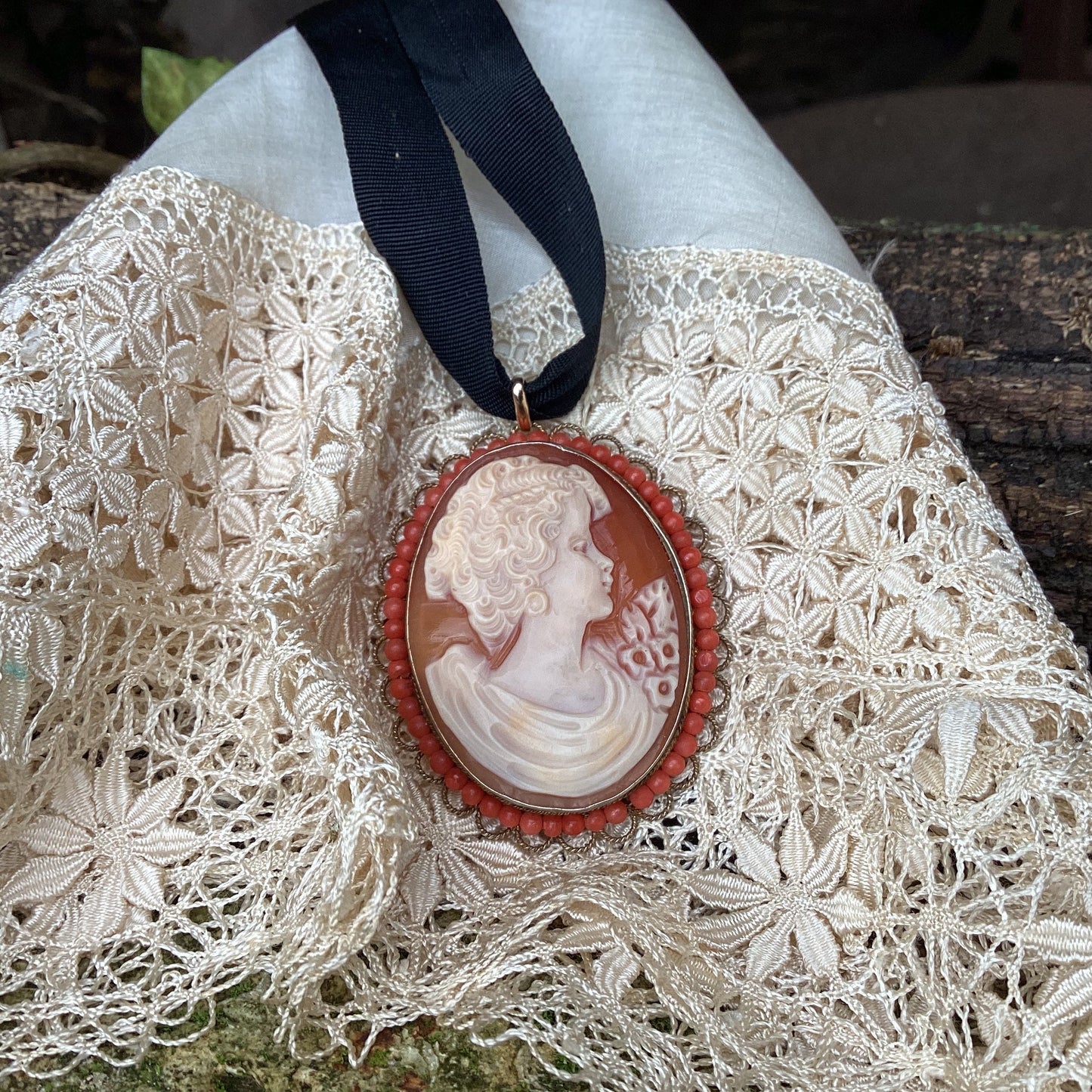 Add Antique French Cameo Necklace Pendant, Coral Beads, Gold Plated Silver to the cart