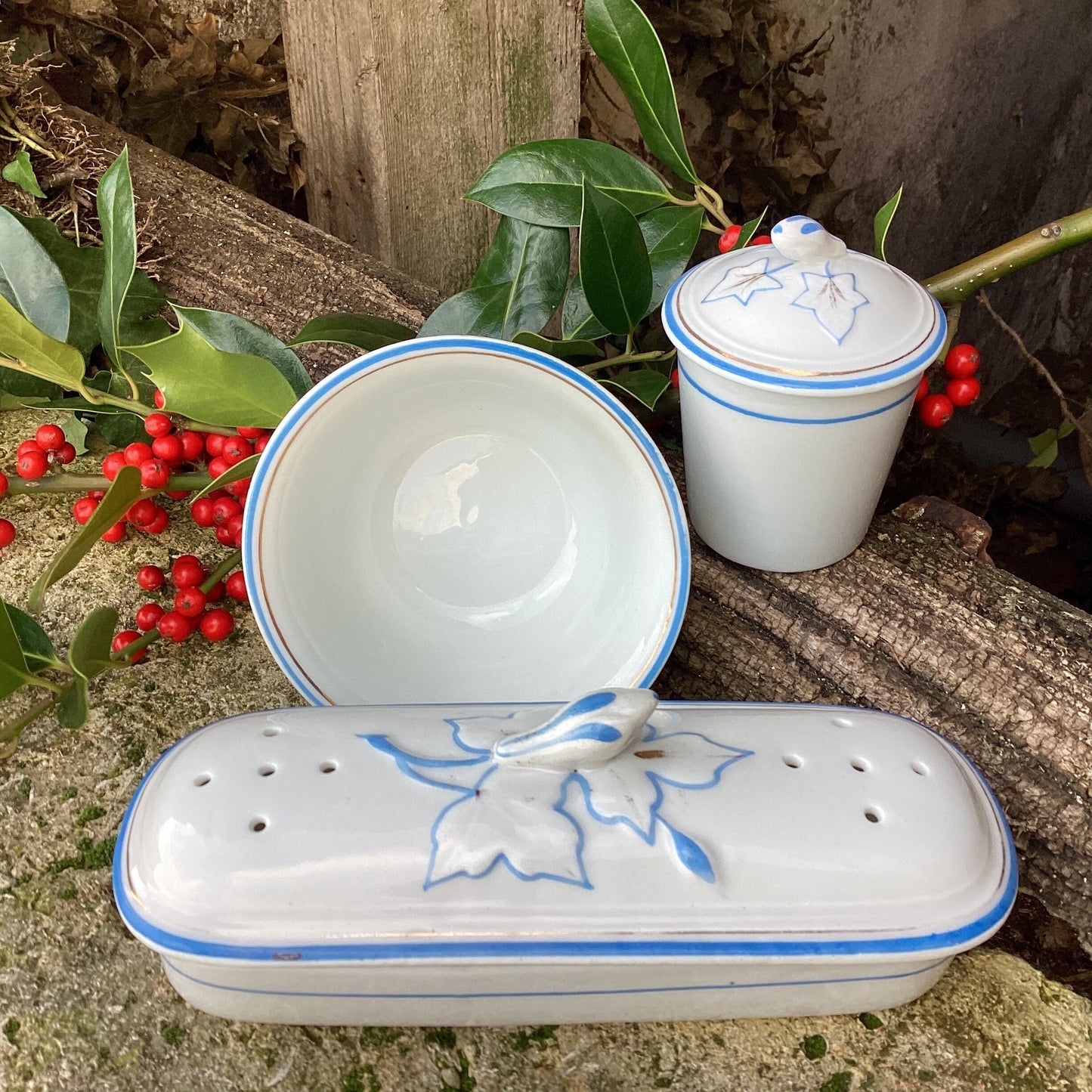 Add Antique Mehun Porcelain Cream Pots with Serving Dish: Blue & White, Set of 5 to the cart