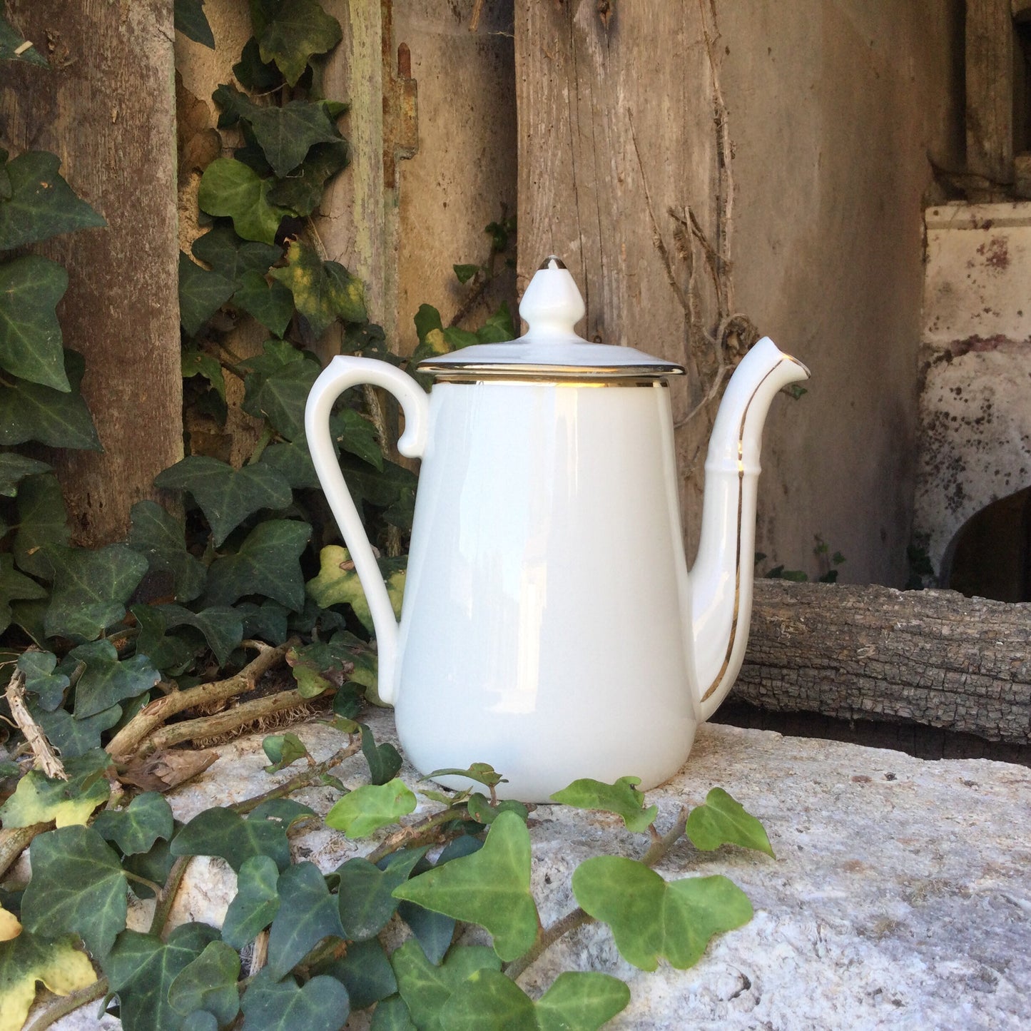 Add Vintage Pillivuyt Porcelain Coffee Pot, Gold Accent French Creamer to the cart