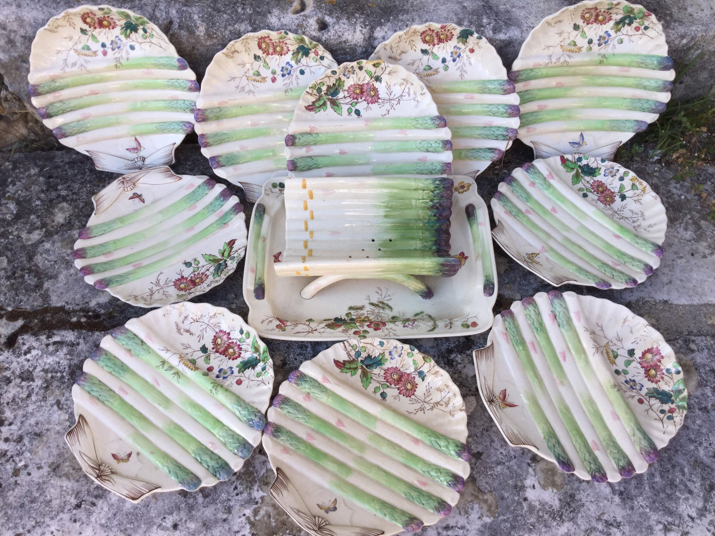 Add Antique Majolica Asparagus Set, Floribel Barbotine Shell Dishes, English Pottery 1870 to the cart