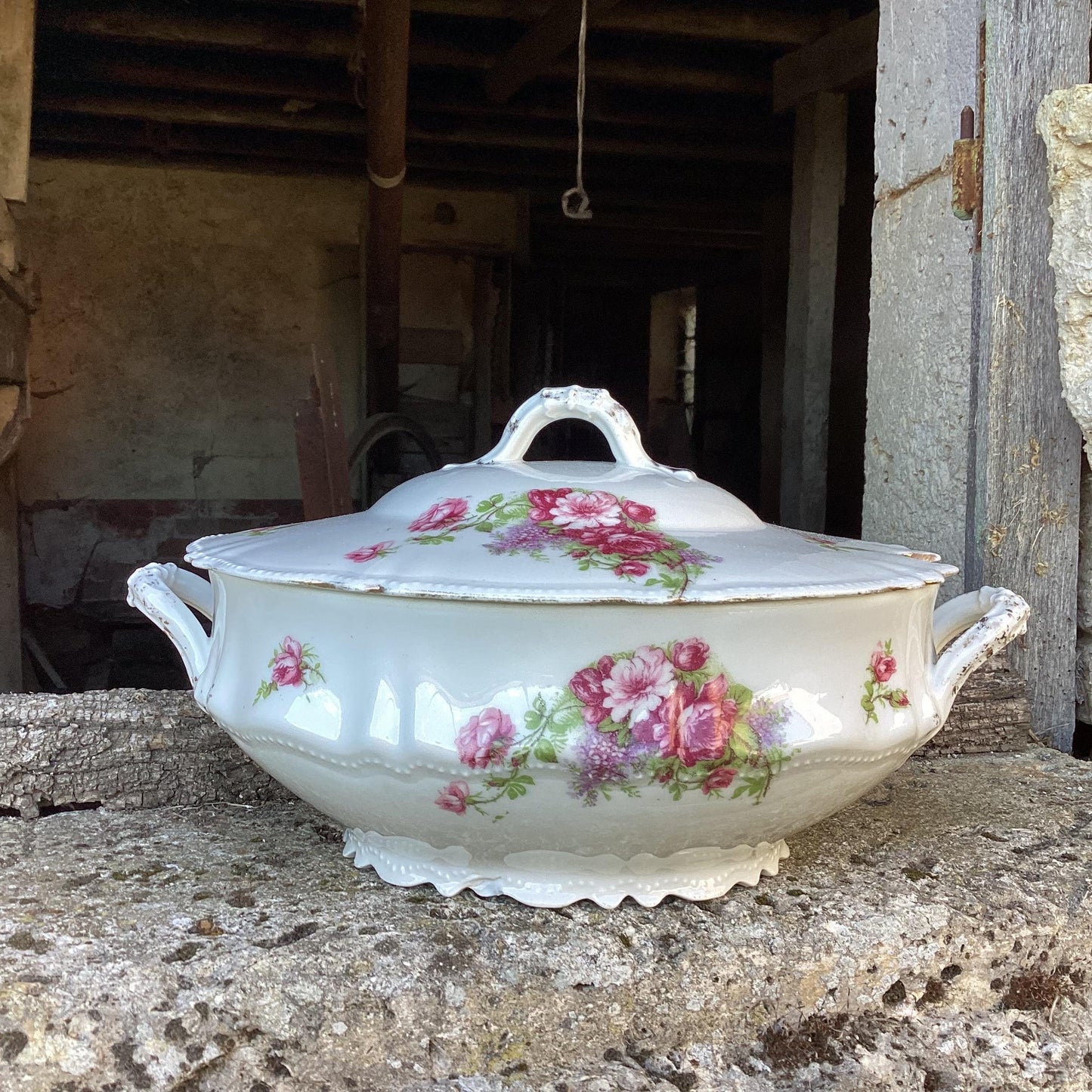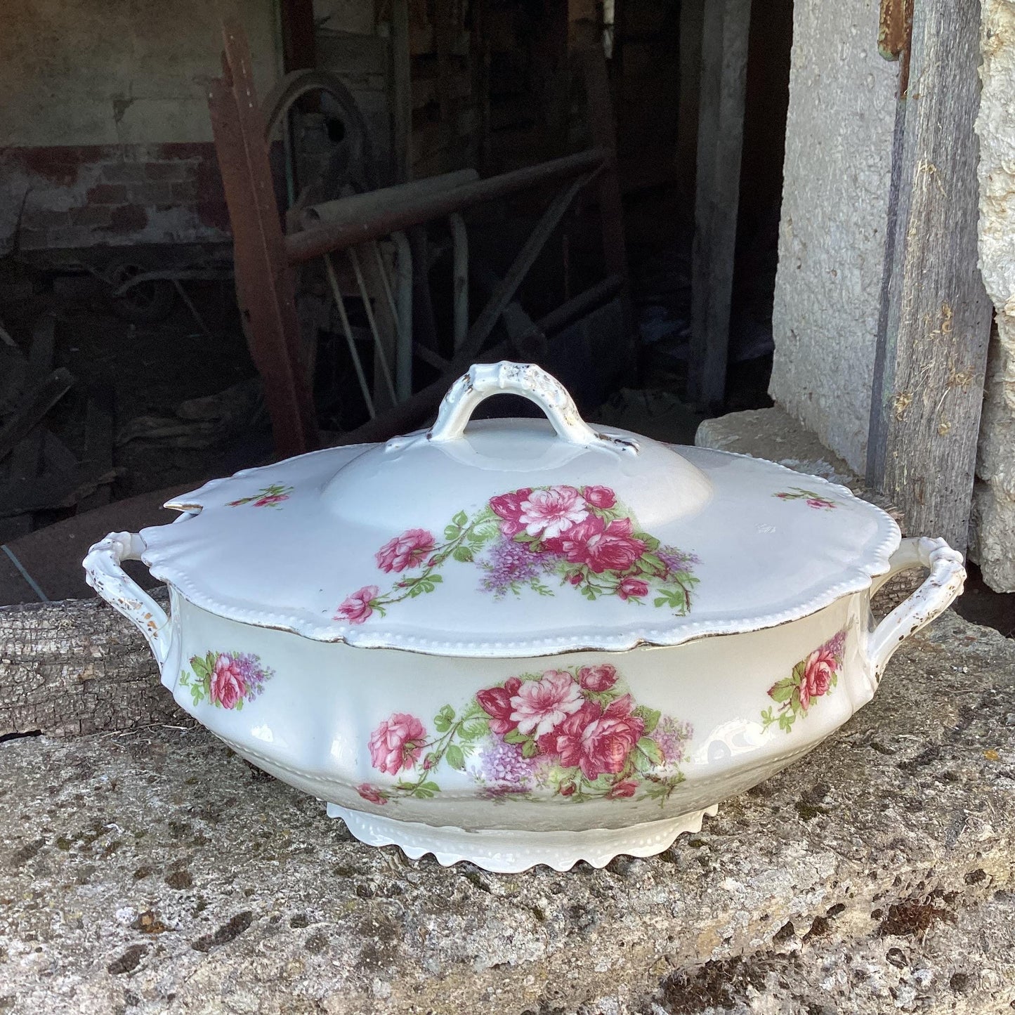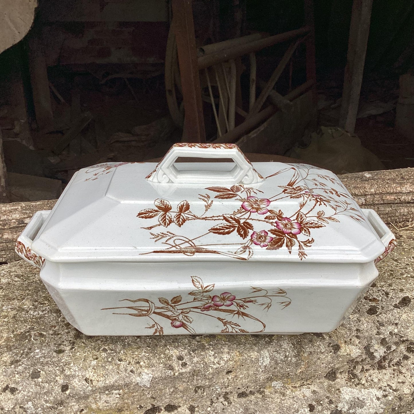 Add Antique Carouge Faïence Lidded Serving Dish, Wild Rose Design to the cart