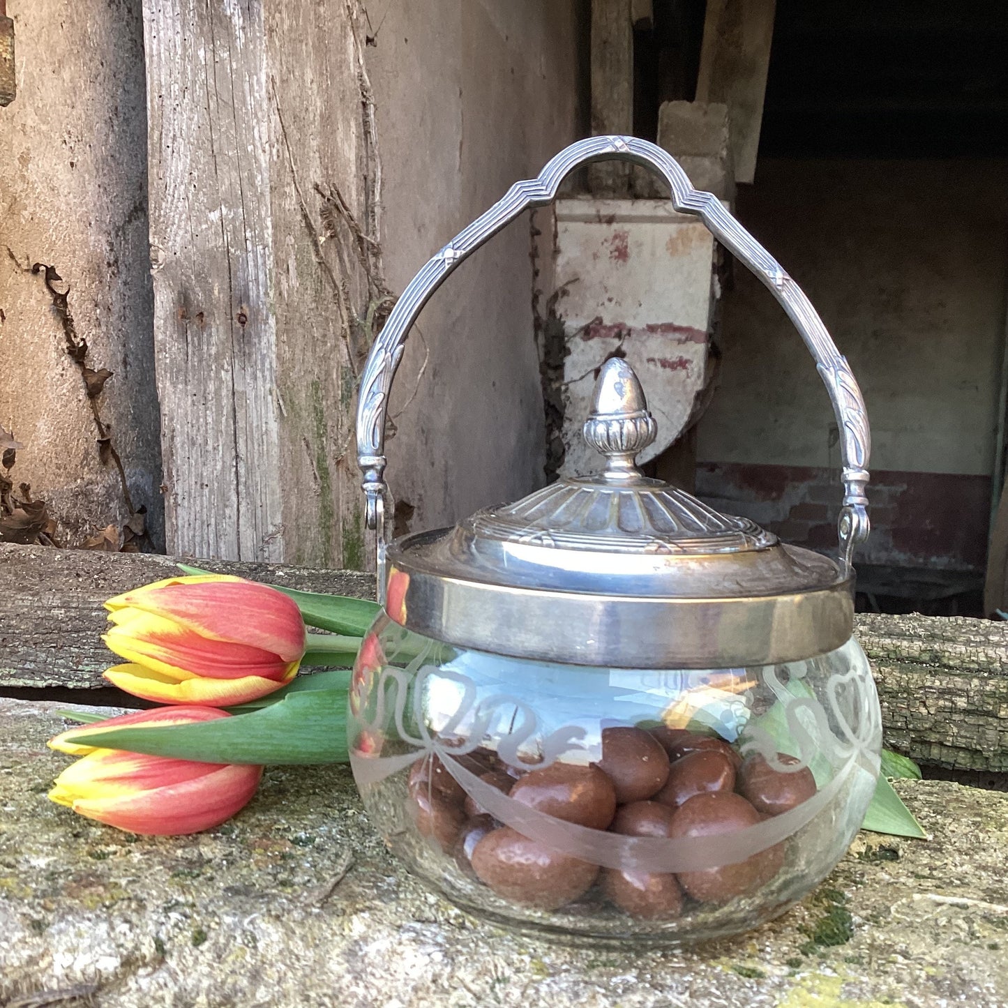 Add French Vintage Cookie Jar, Etched Crystal & Silver Plated Lid to the cart
