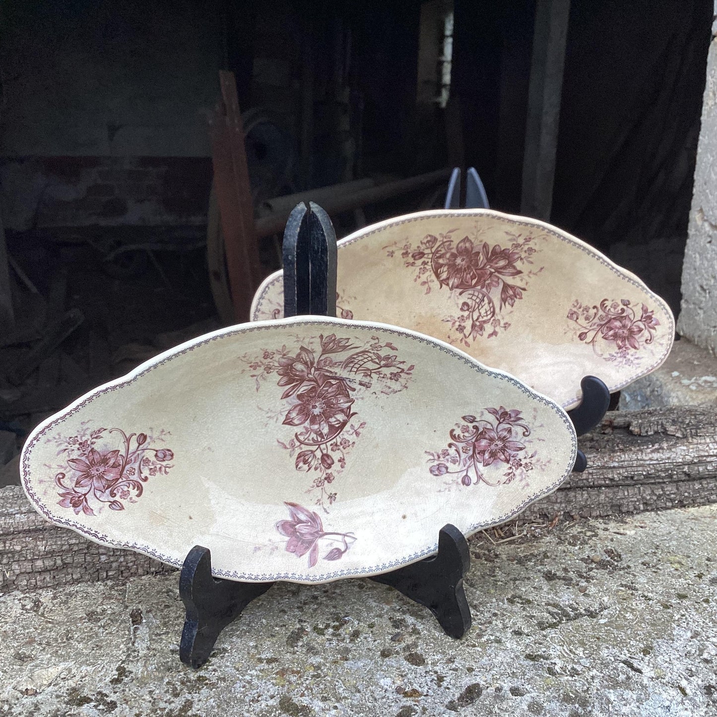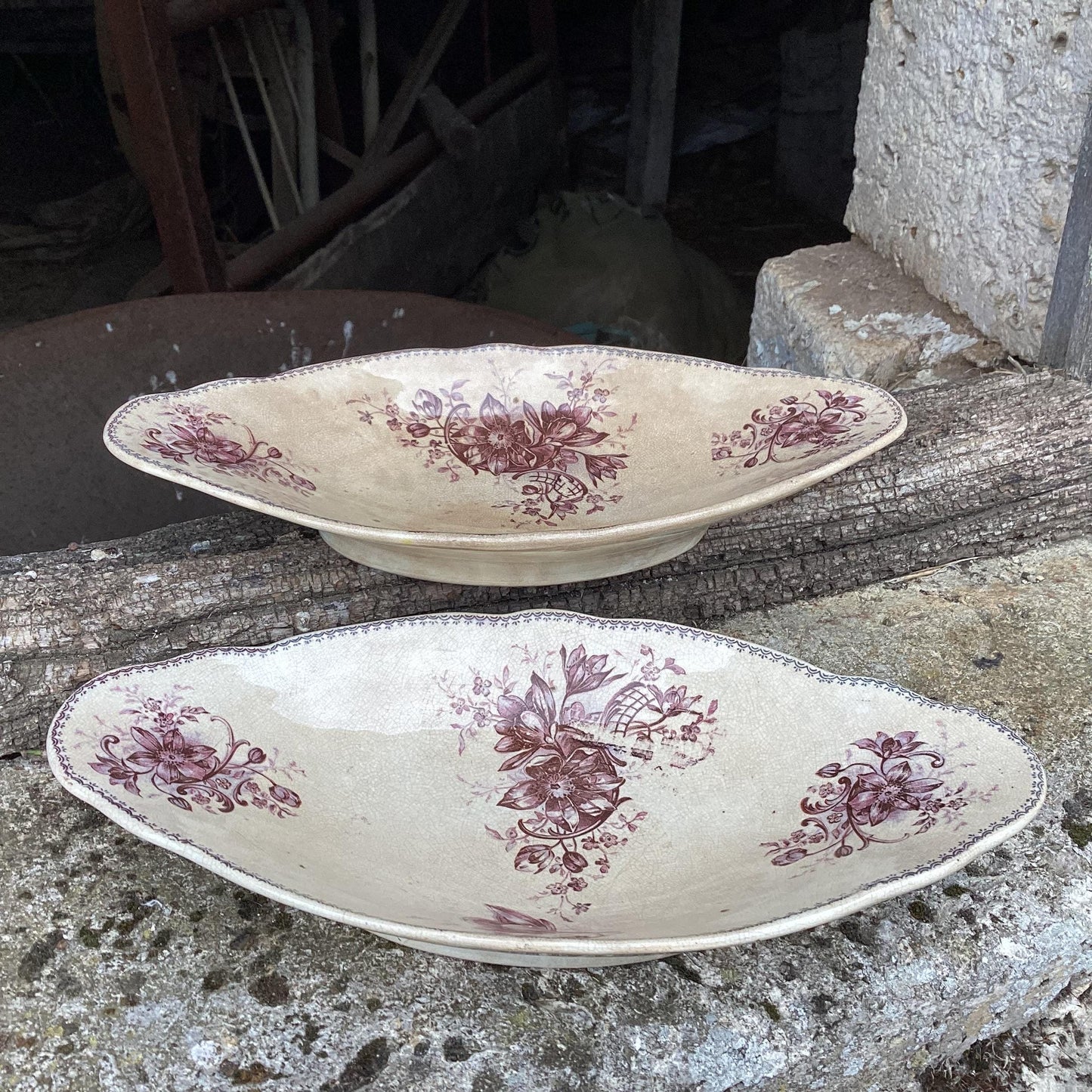 Add Antique Nimy Faience Relish Dishes, Aubergine Floral, Belgium Ceramics (Set of 2) to the cart