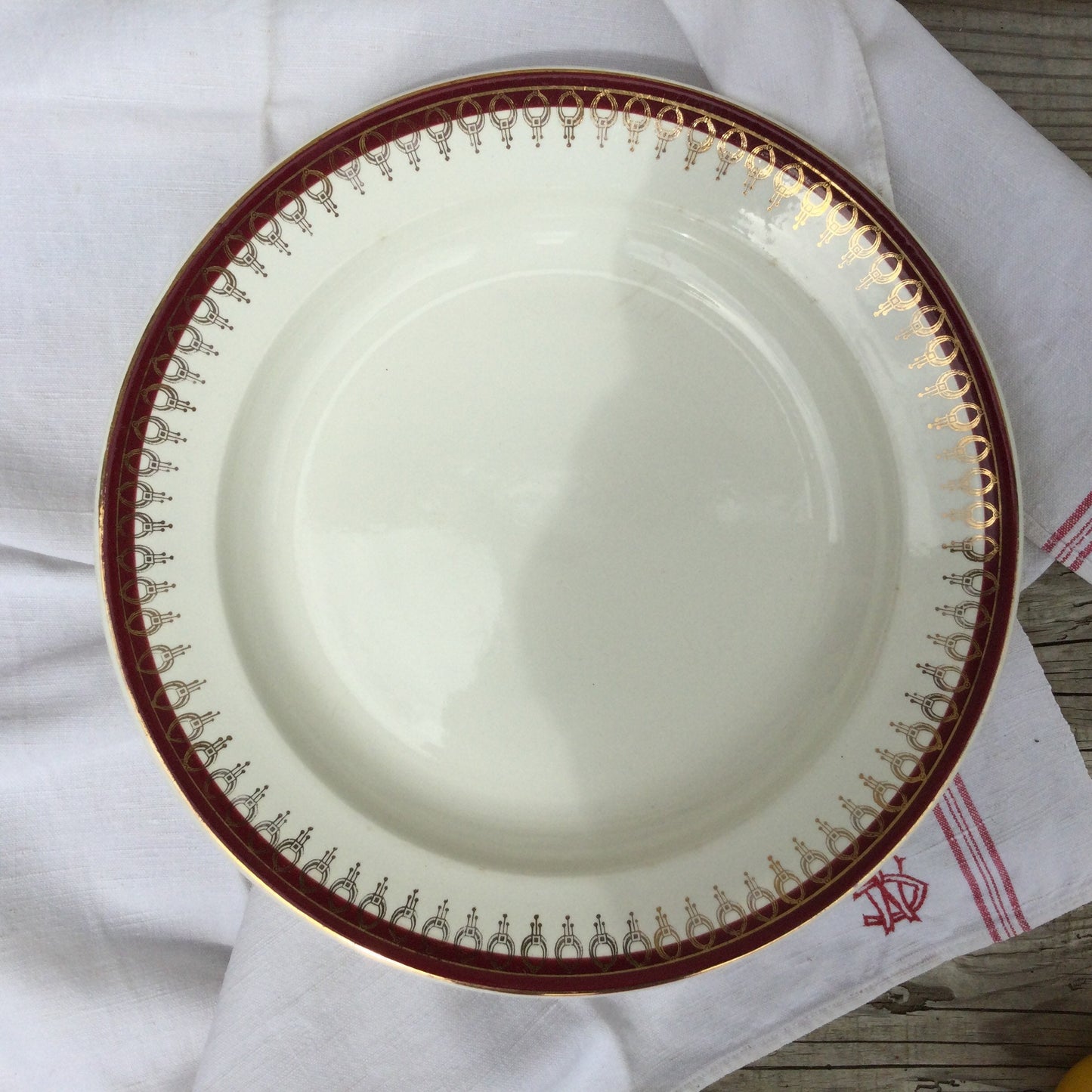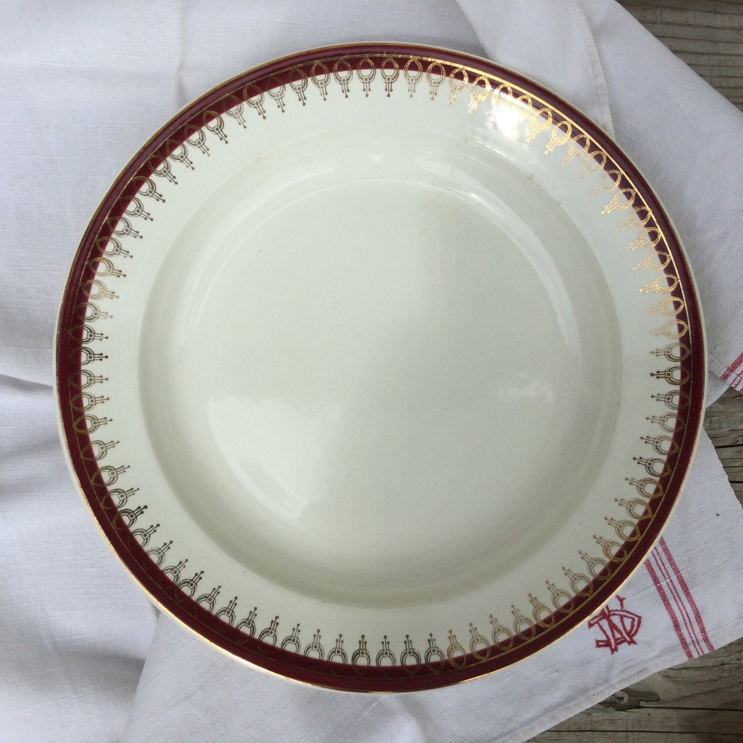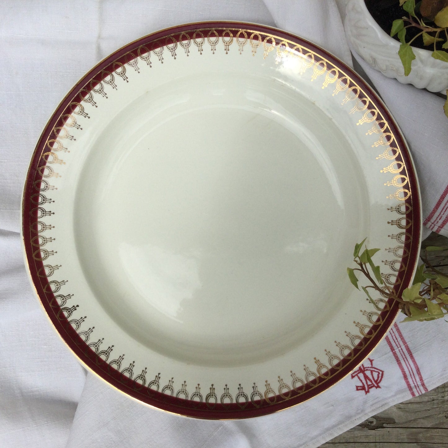 1920s Salins Porcelain Serving Platter, Lima Rouge Design, Bordeaux Red & Gold
