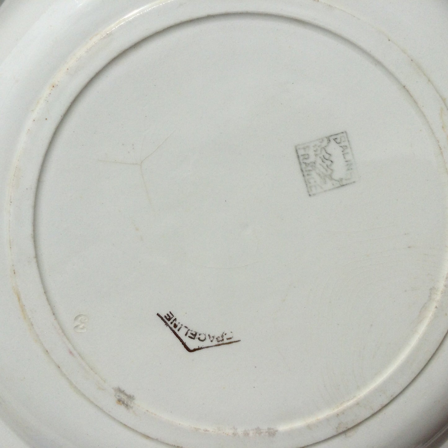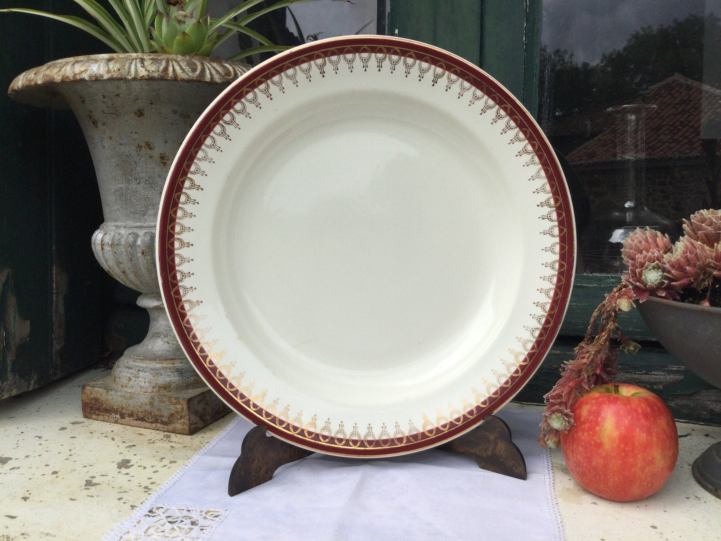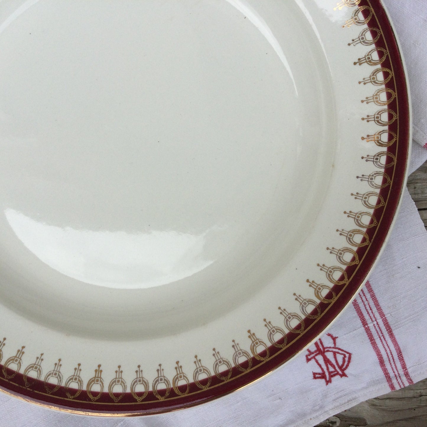 1920s Salins Porcelain Serving Platter, Lima Rouge Design, Bordeaux Red & Gold