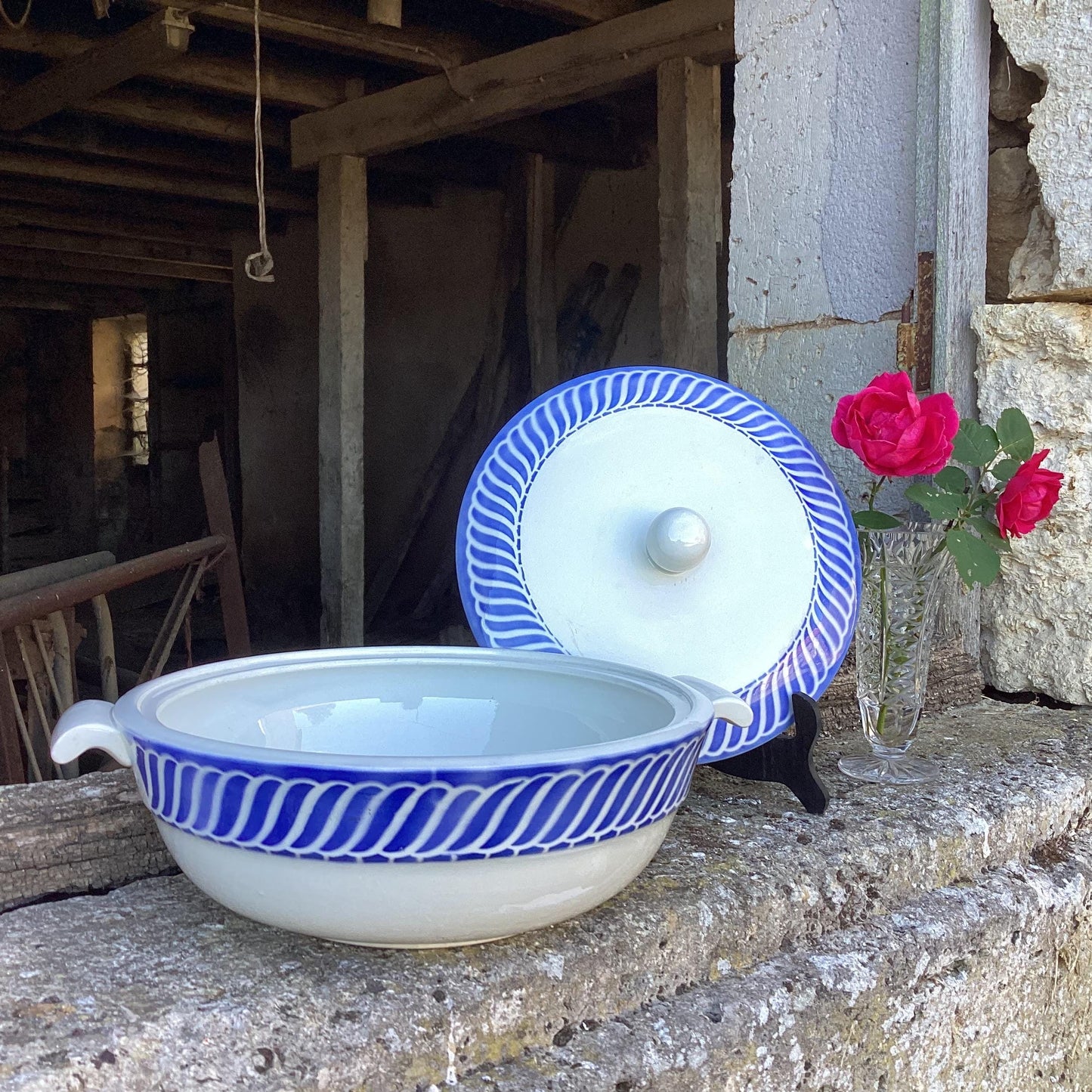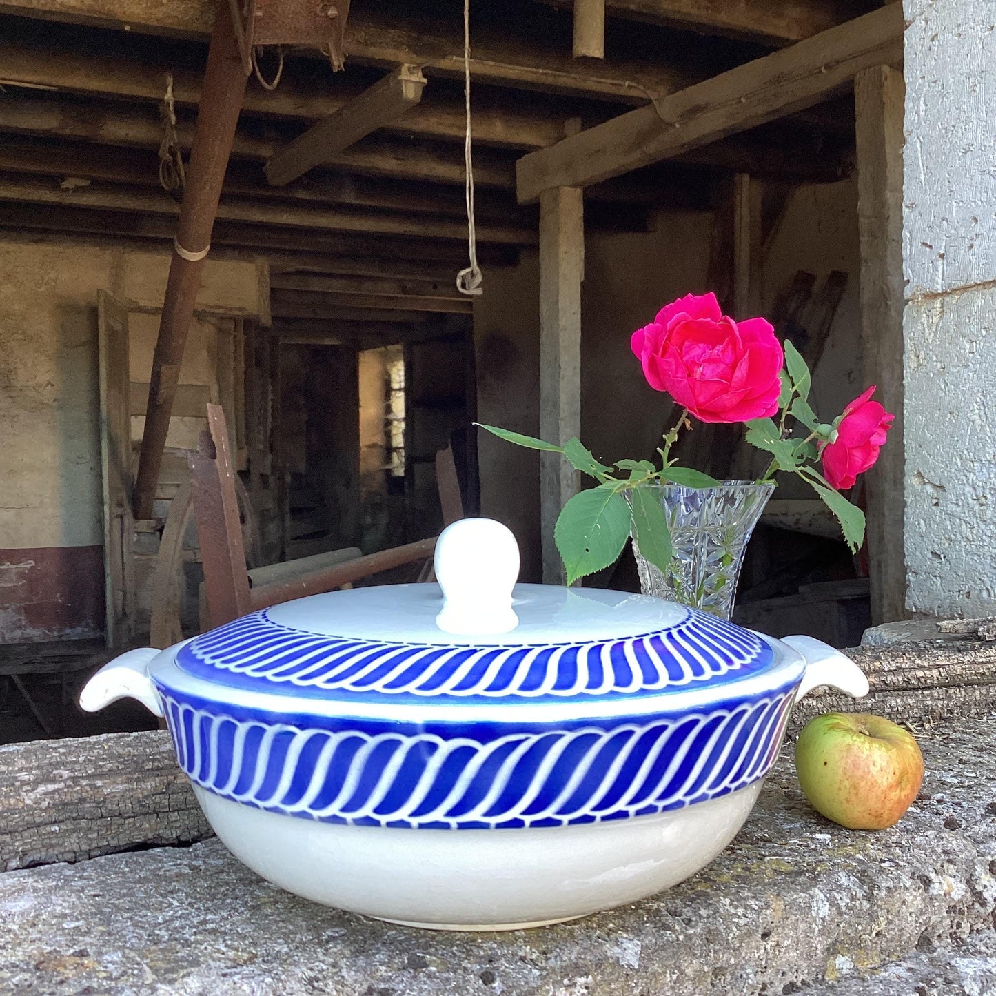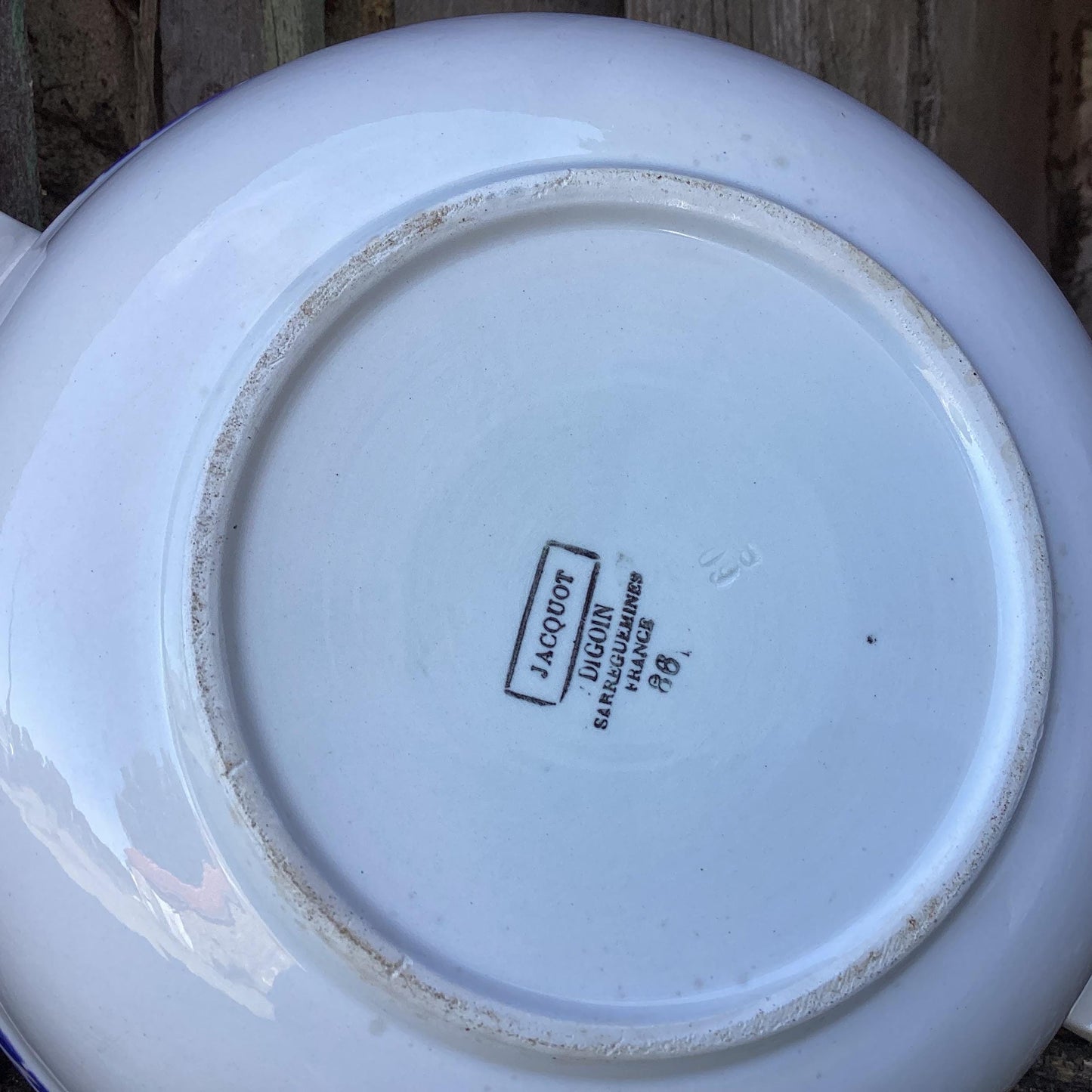Vintage Digoin Sarreguemines Covered Bowl, Jacquot Blue Design