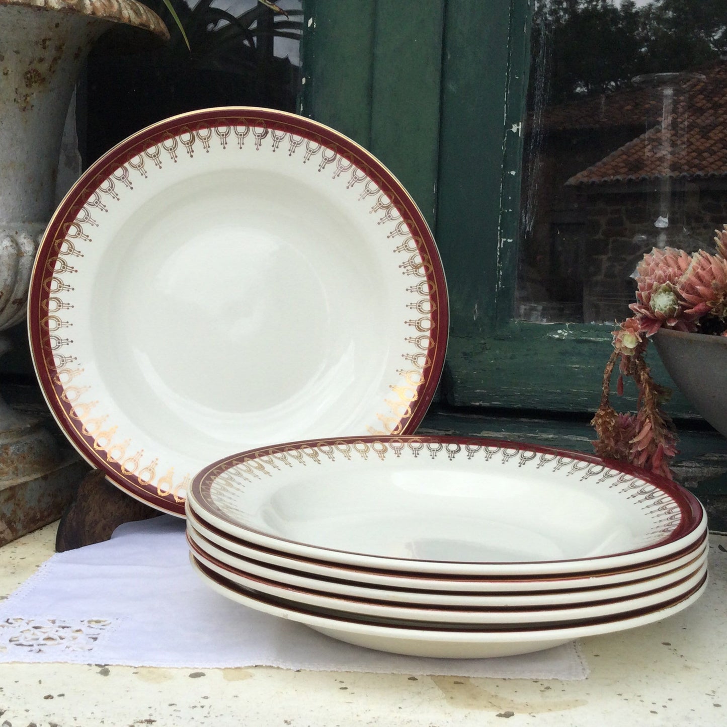 Add Set of 6 Art Nouveau Salins Porcelain Bowls, Lima Rouge Design to the cart