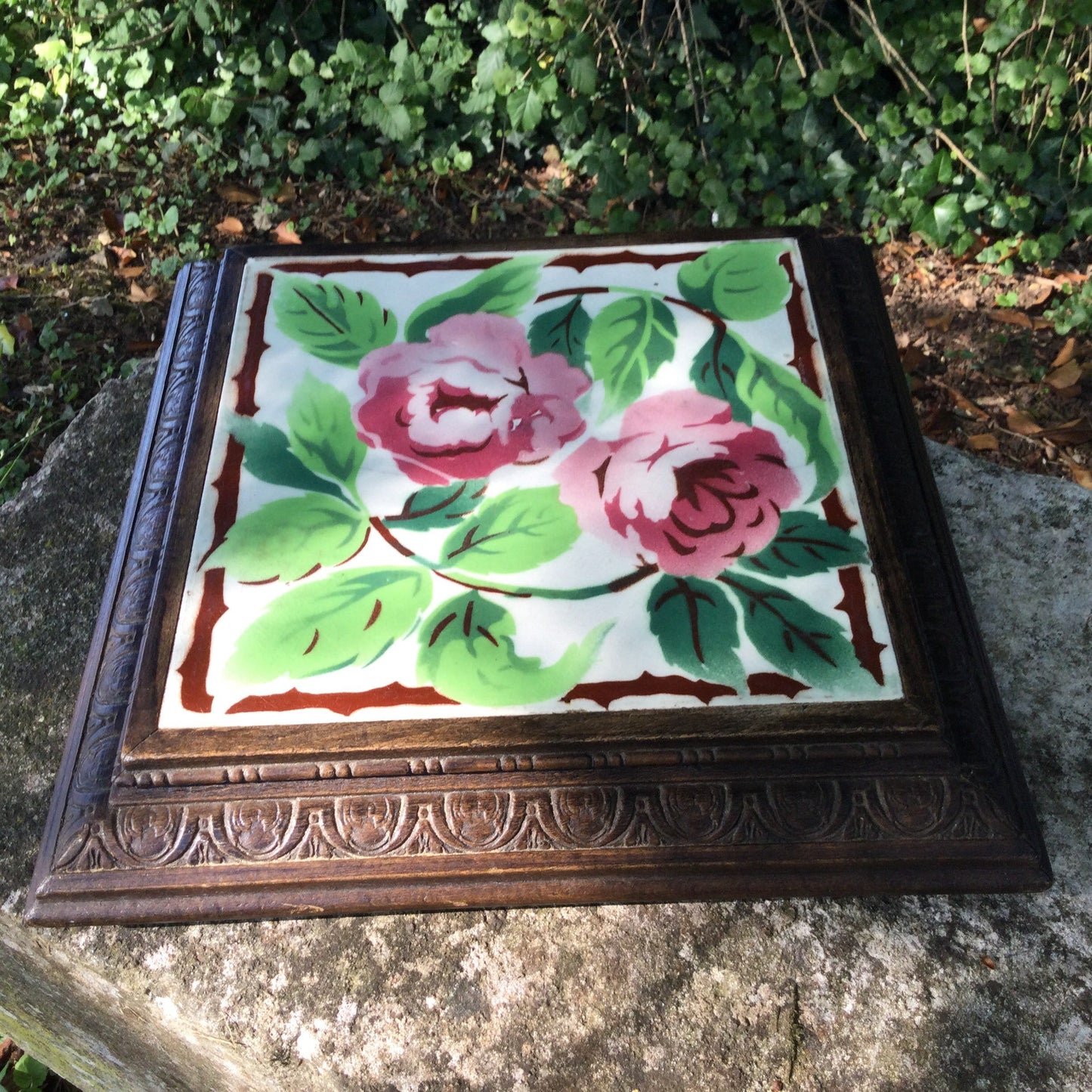 Add French Vintage Ceramic Trivet : Art Deco Pink Roses, Wood Frame to the cart