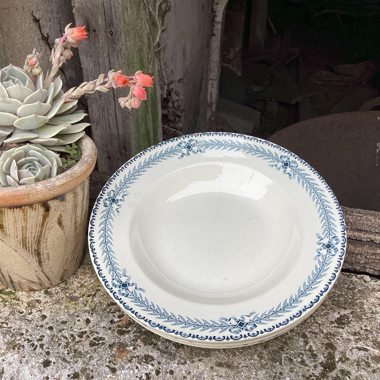Add Antique French Ironstone Soup Bowls, Blue Transferware Faience, Set of 4 to the cart