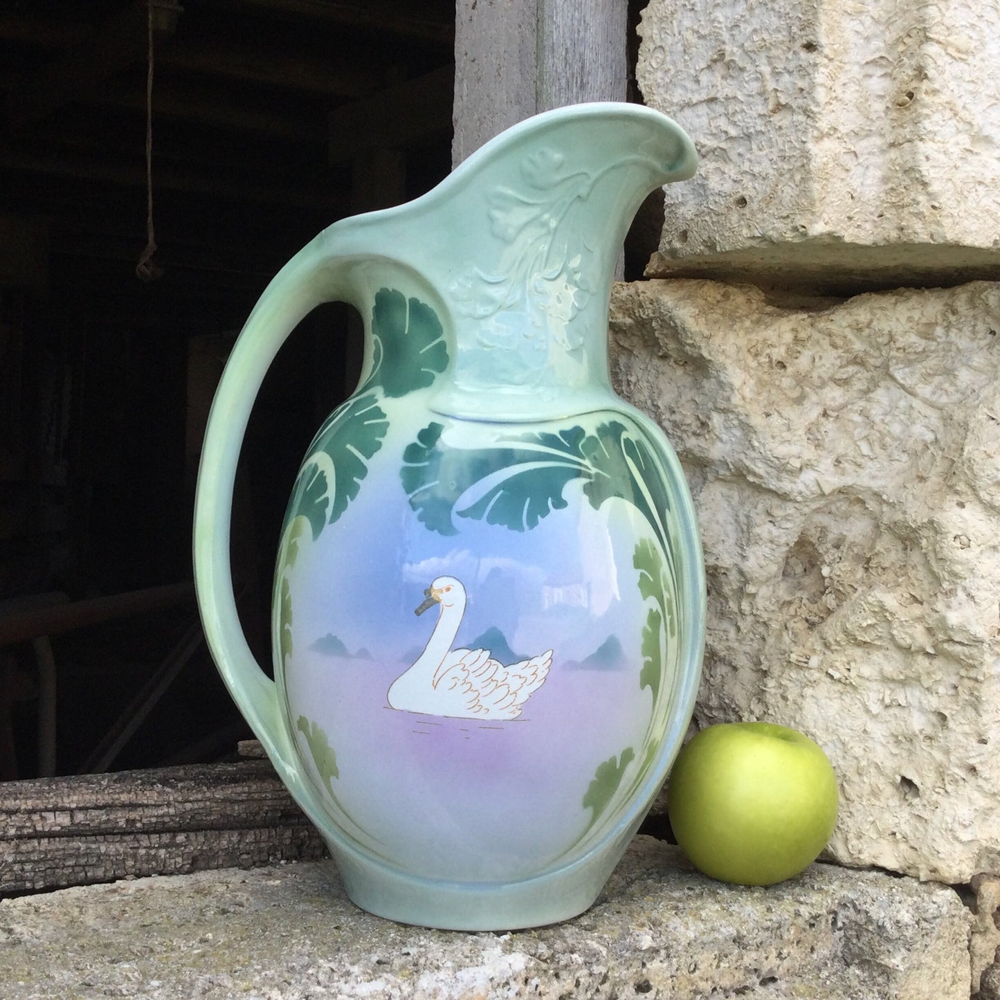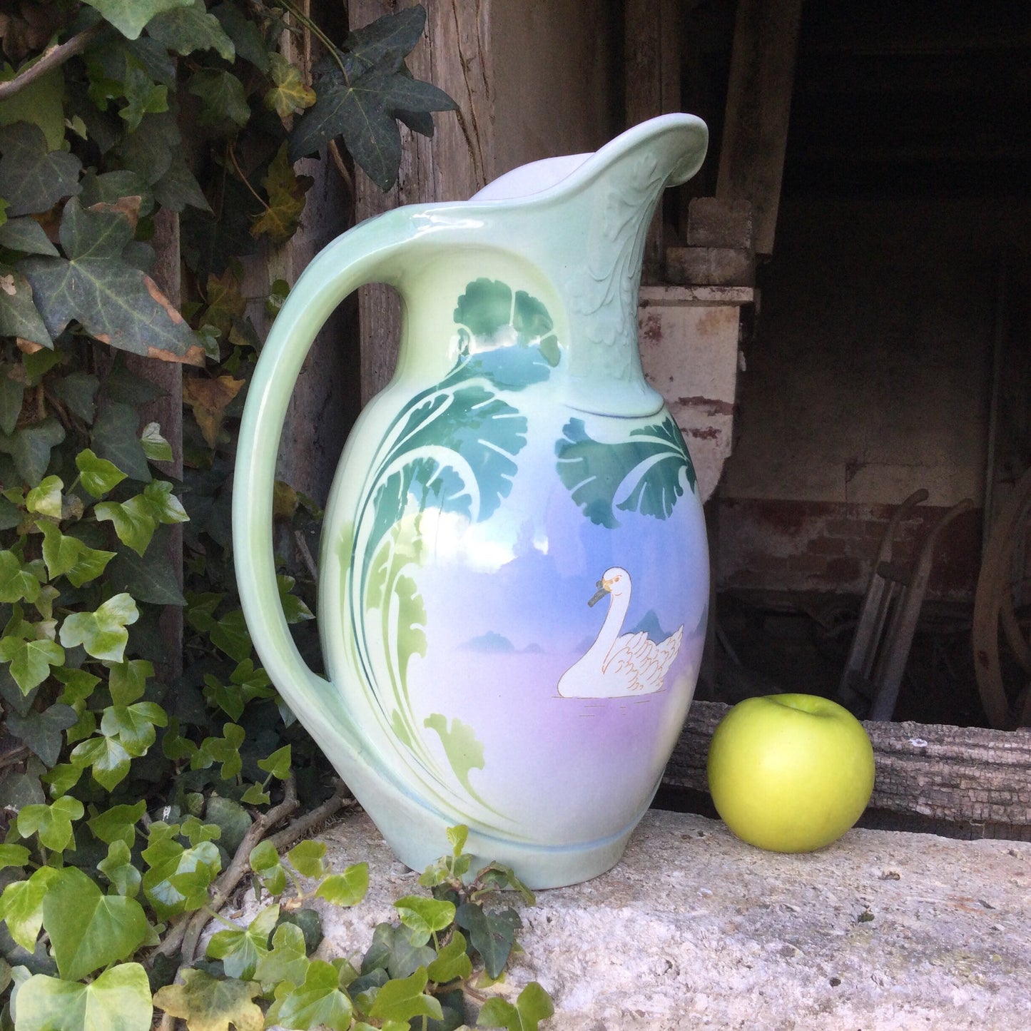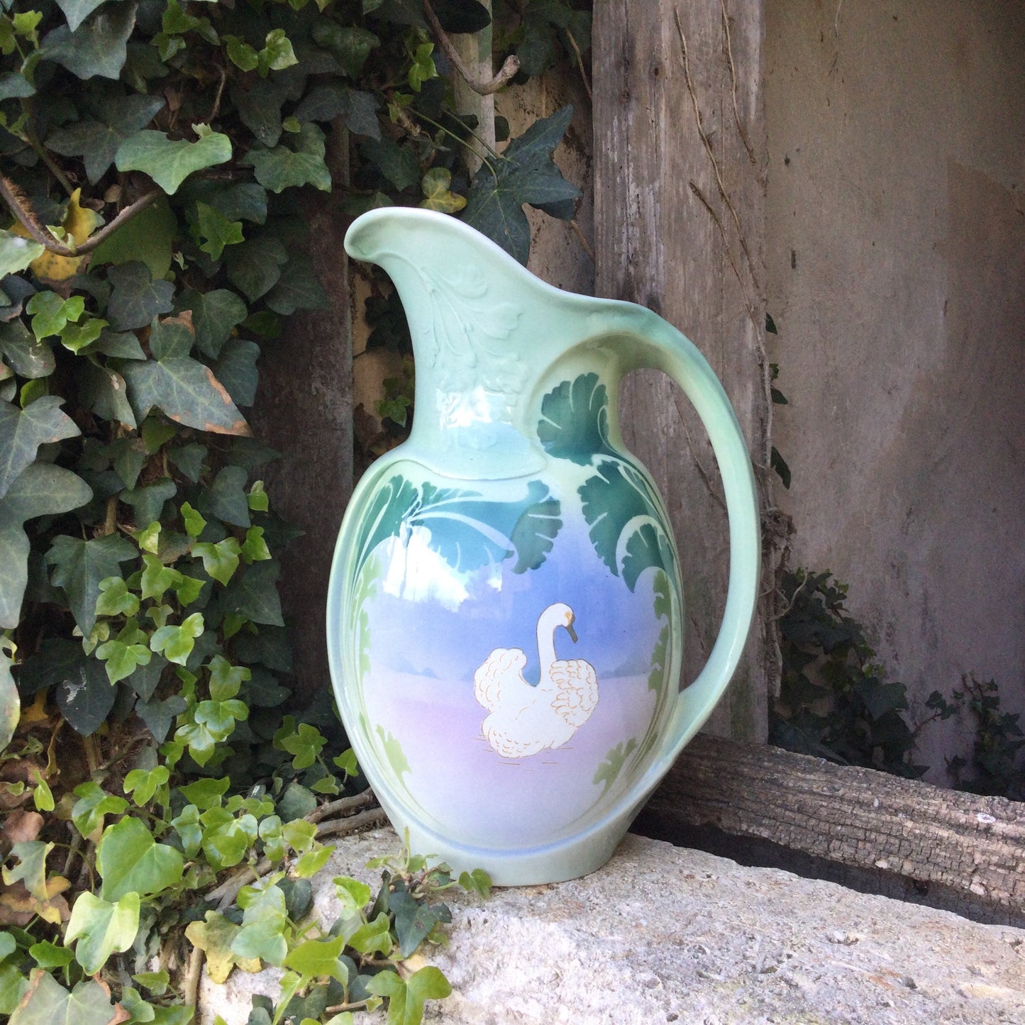 Art Deco Bathroom Pitcher : Luneville ceramics, hand painted, swan decor