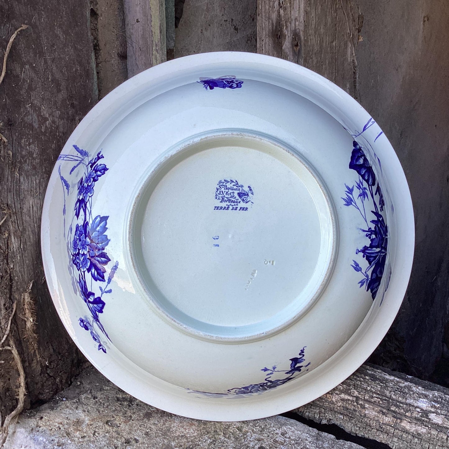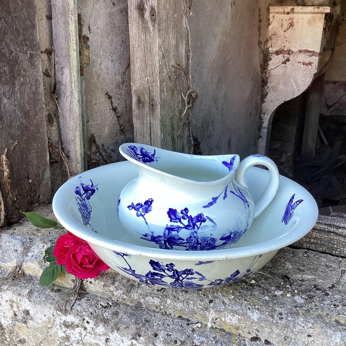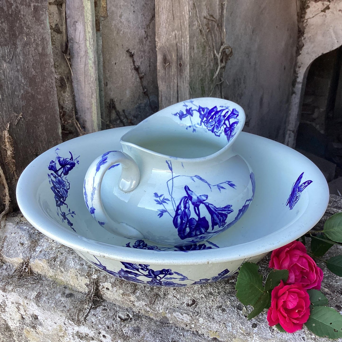 Antique French Ironstone Wash Bowl and Pitcher Set: Blue Butterflies