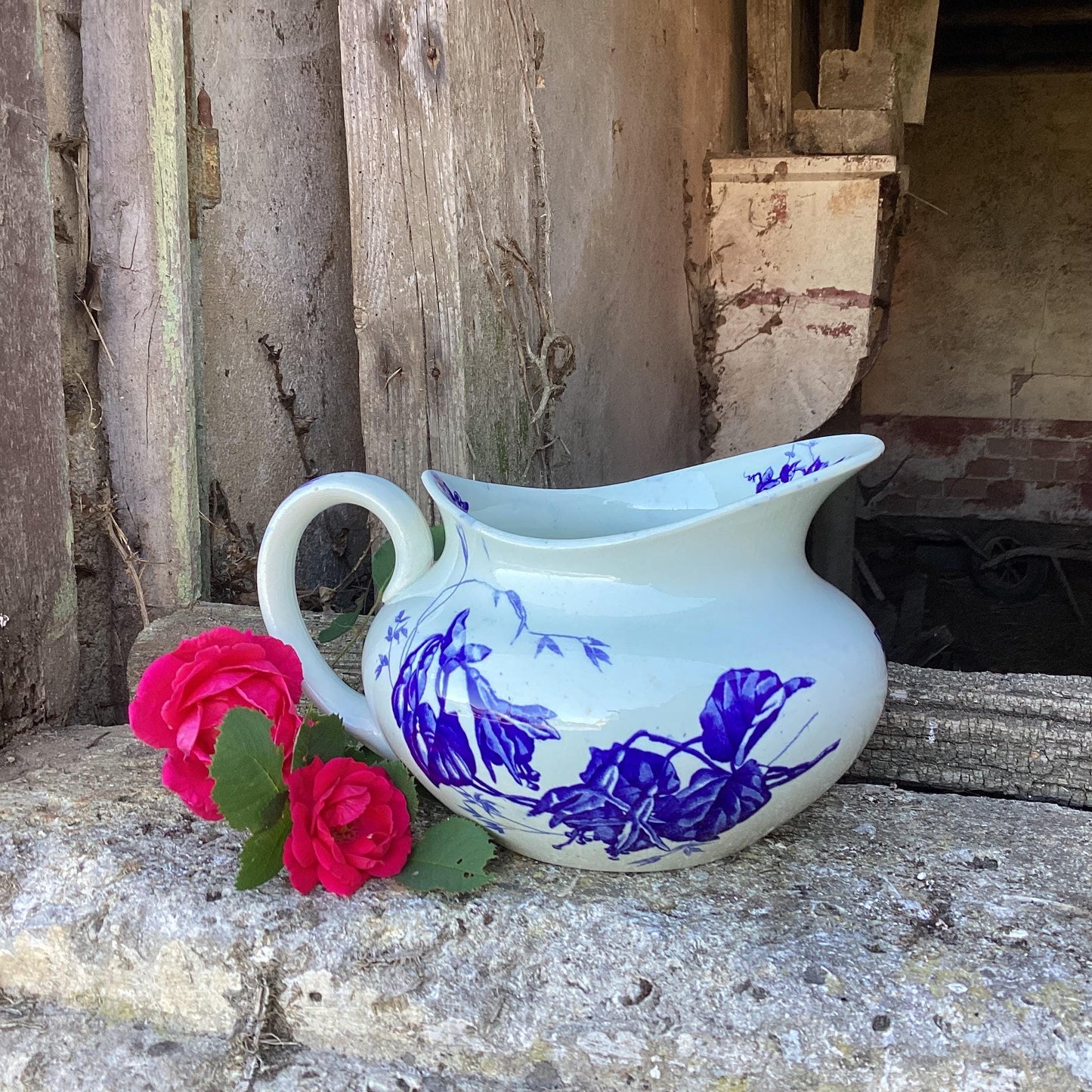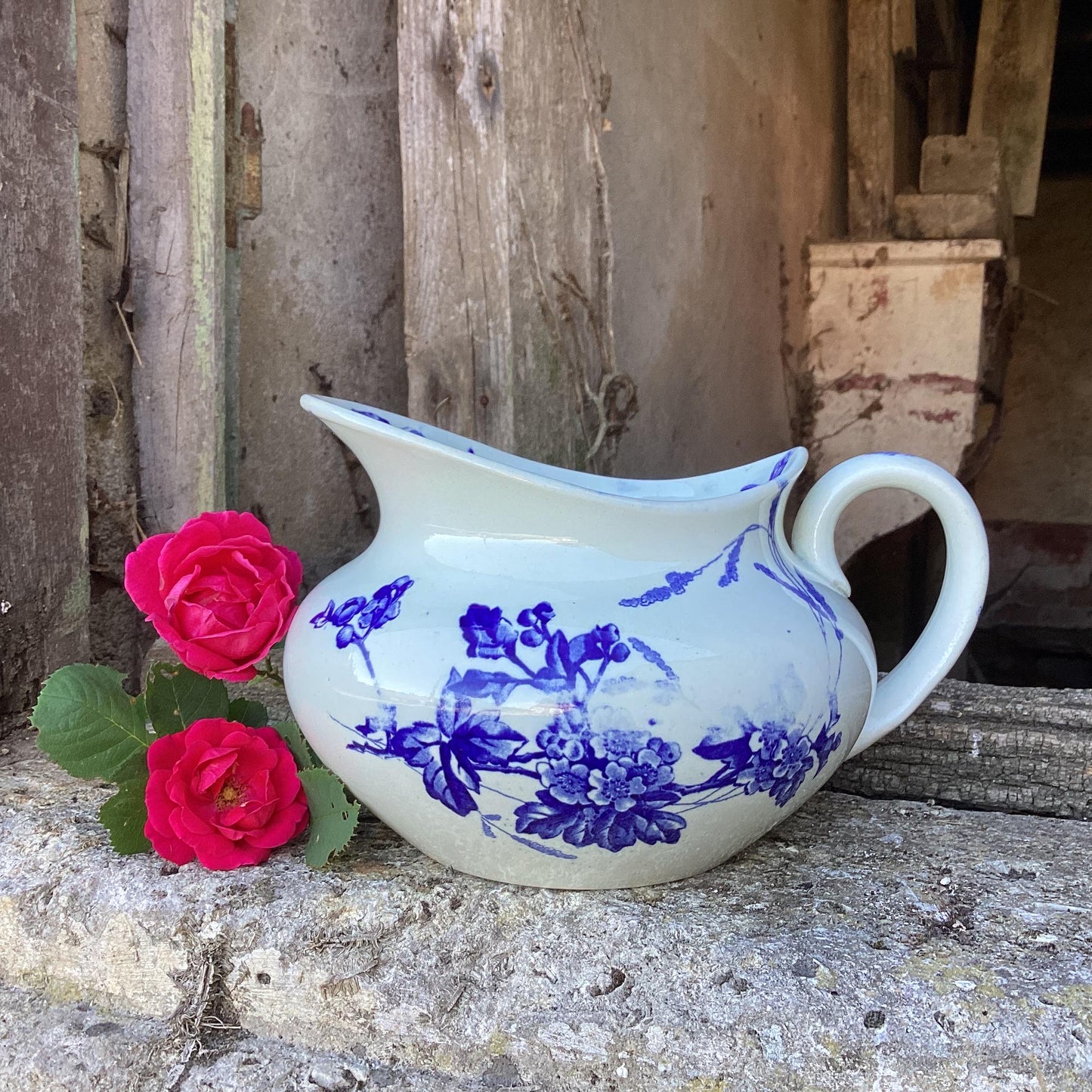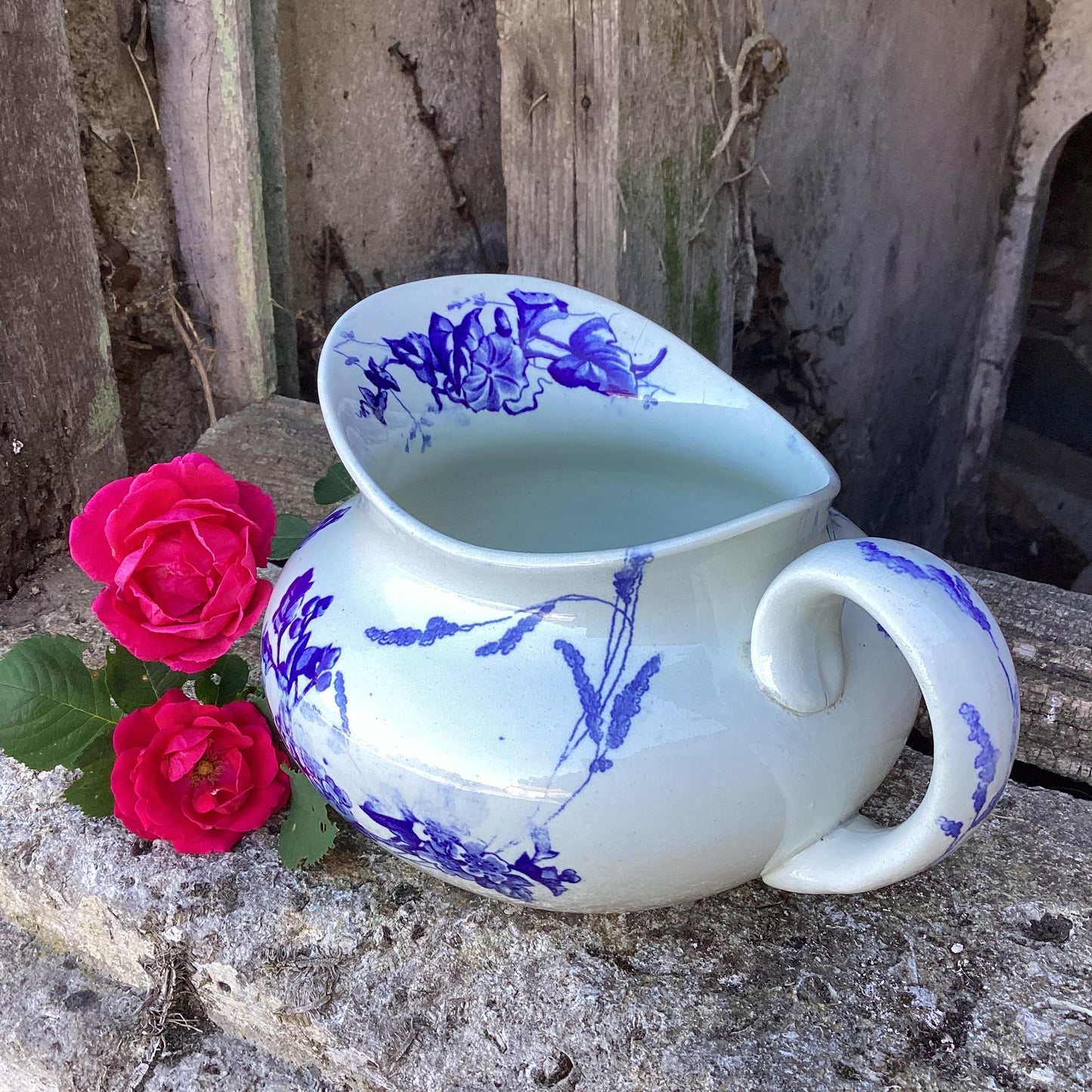 Antique French Ironstone Wash Bowl and Pitcher Set: Blue Butterflies