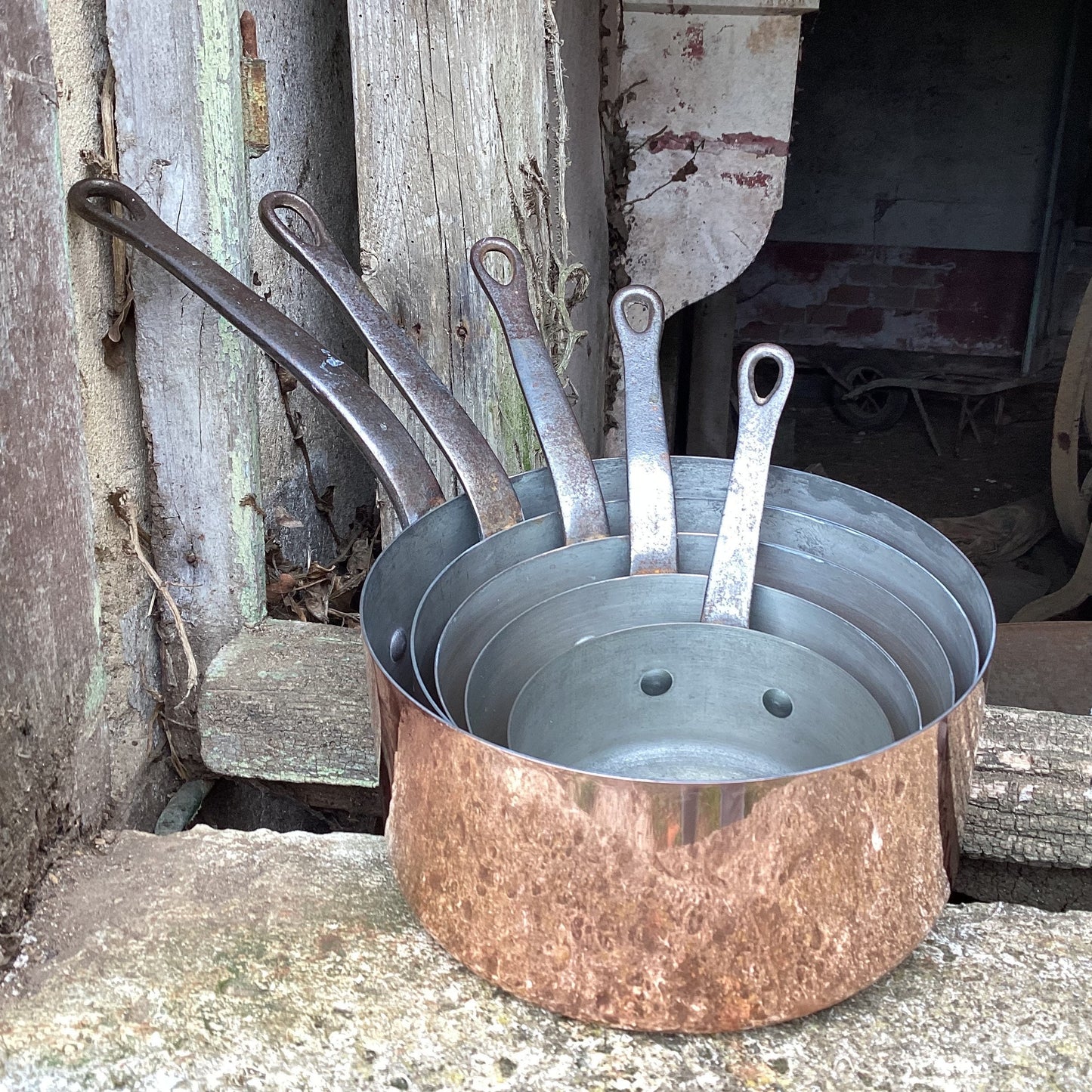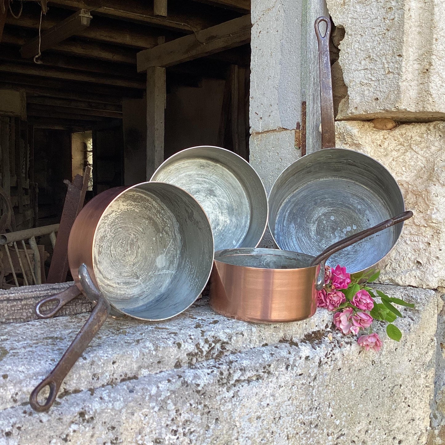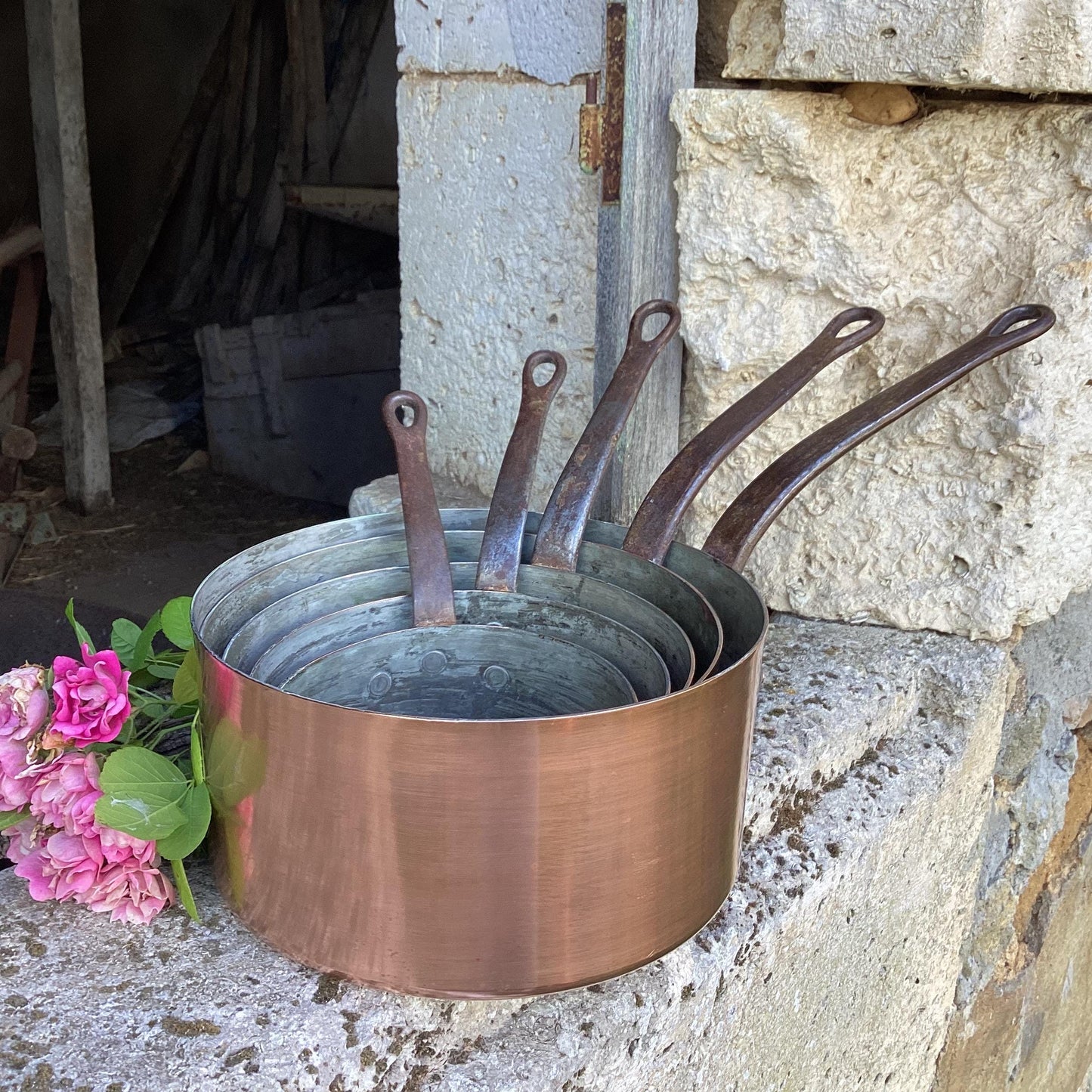 Add French Copper Pans - tin lined - rustic farmhouse decor - set of 5 to the cart