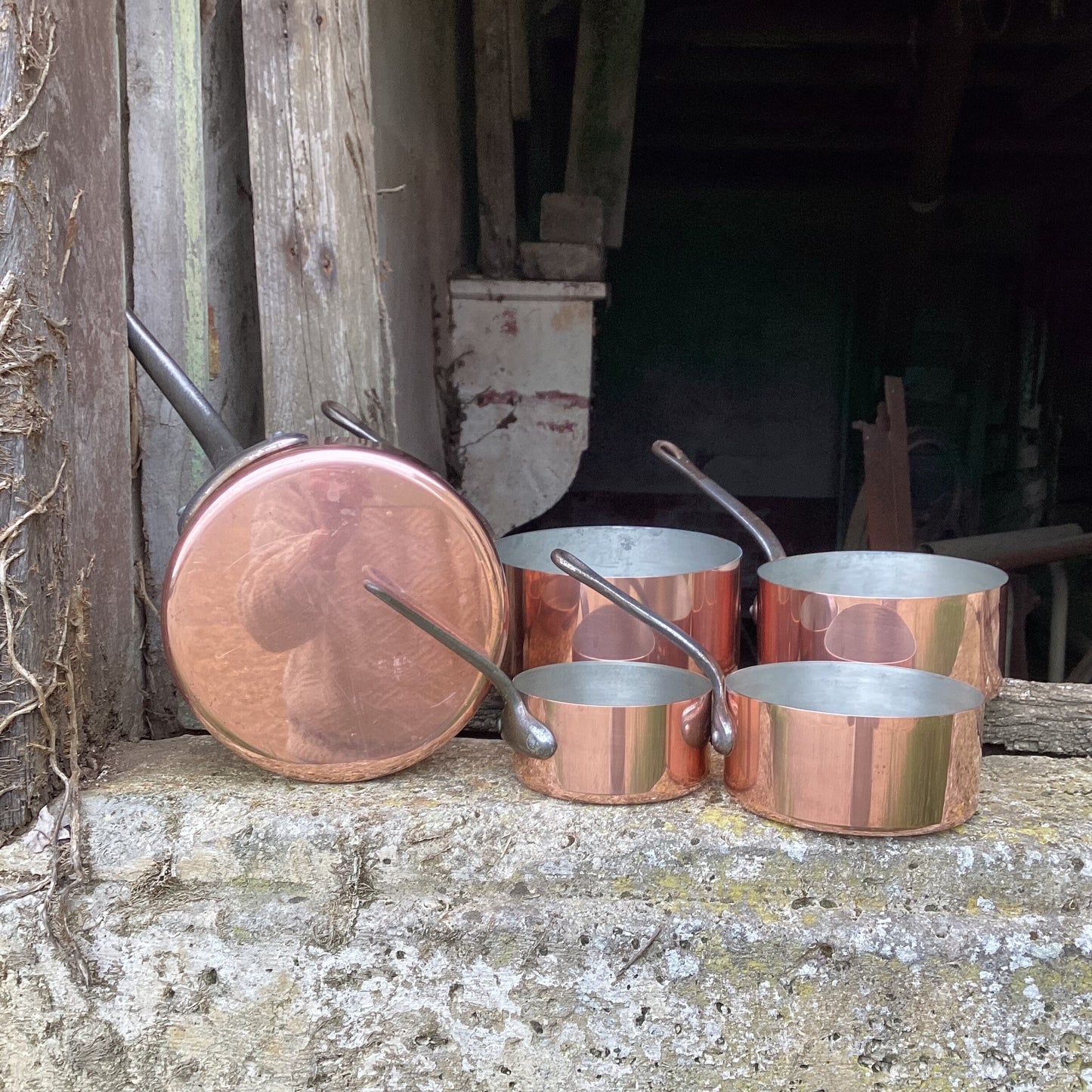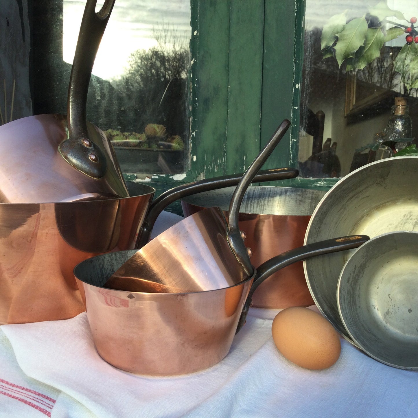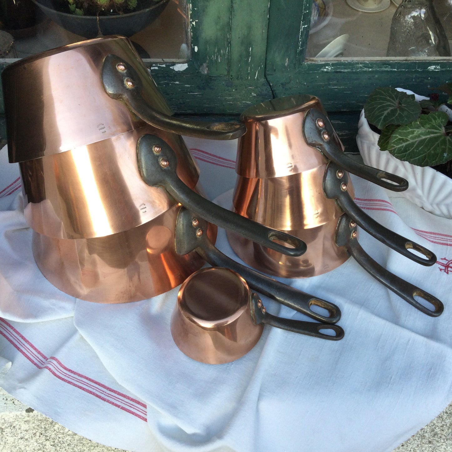 Add French Copper Pans - tin lined - rustic farmhouse decor - set of 5 to the cart