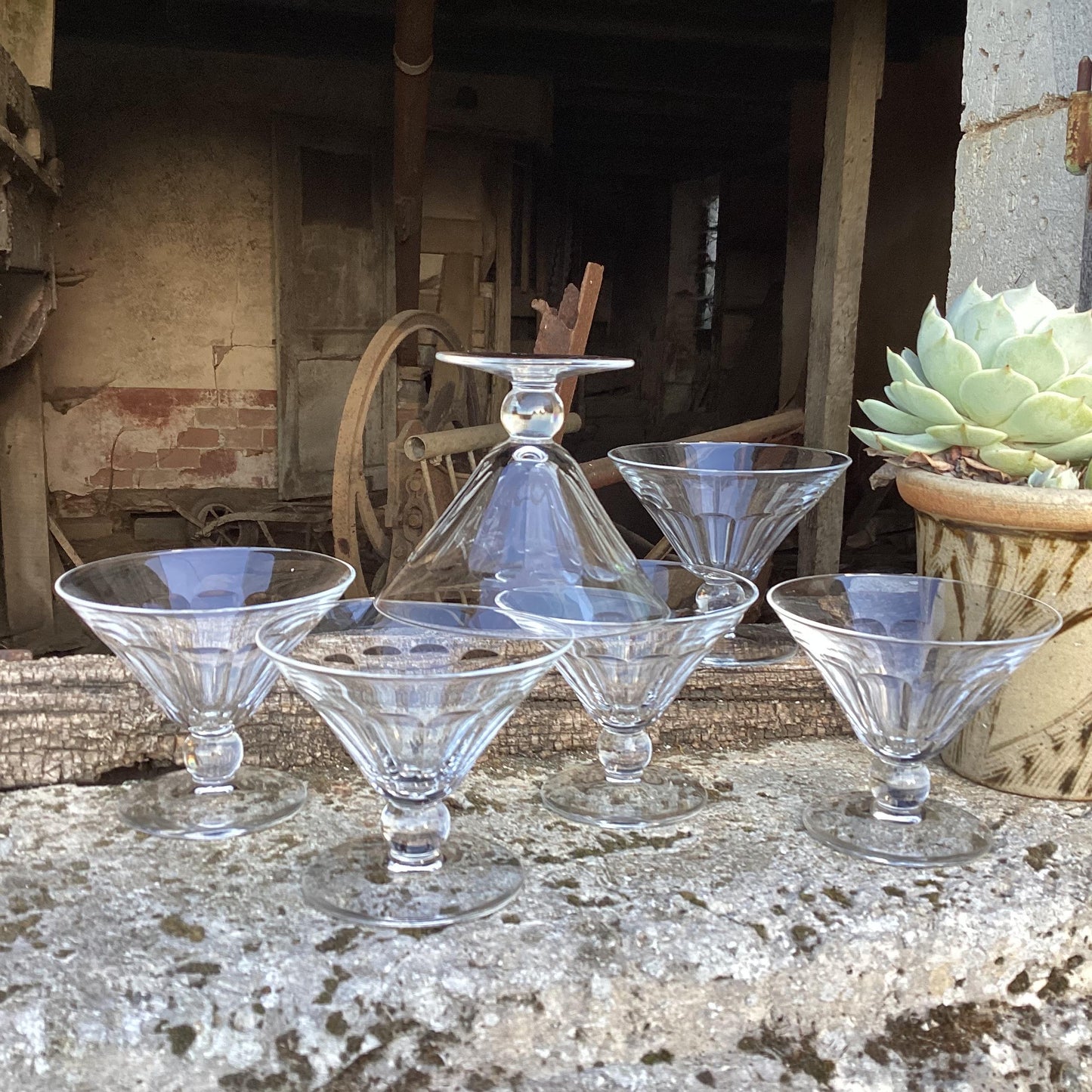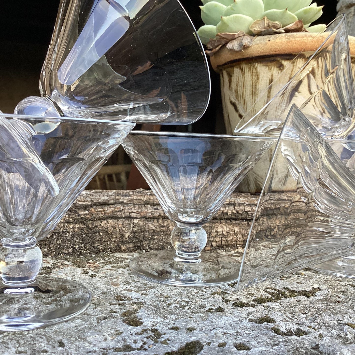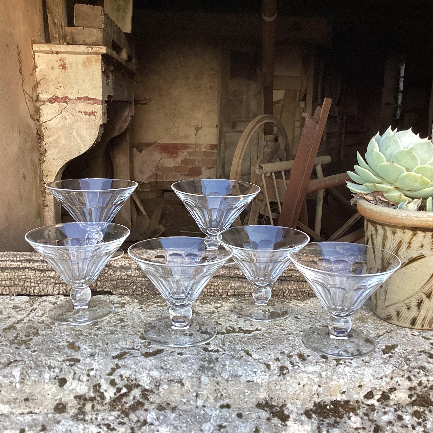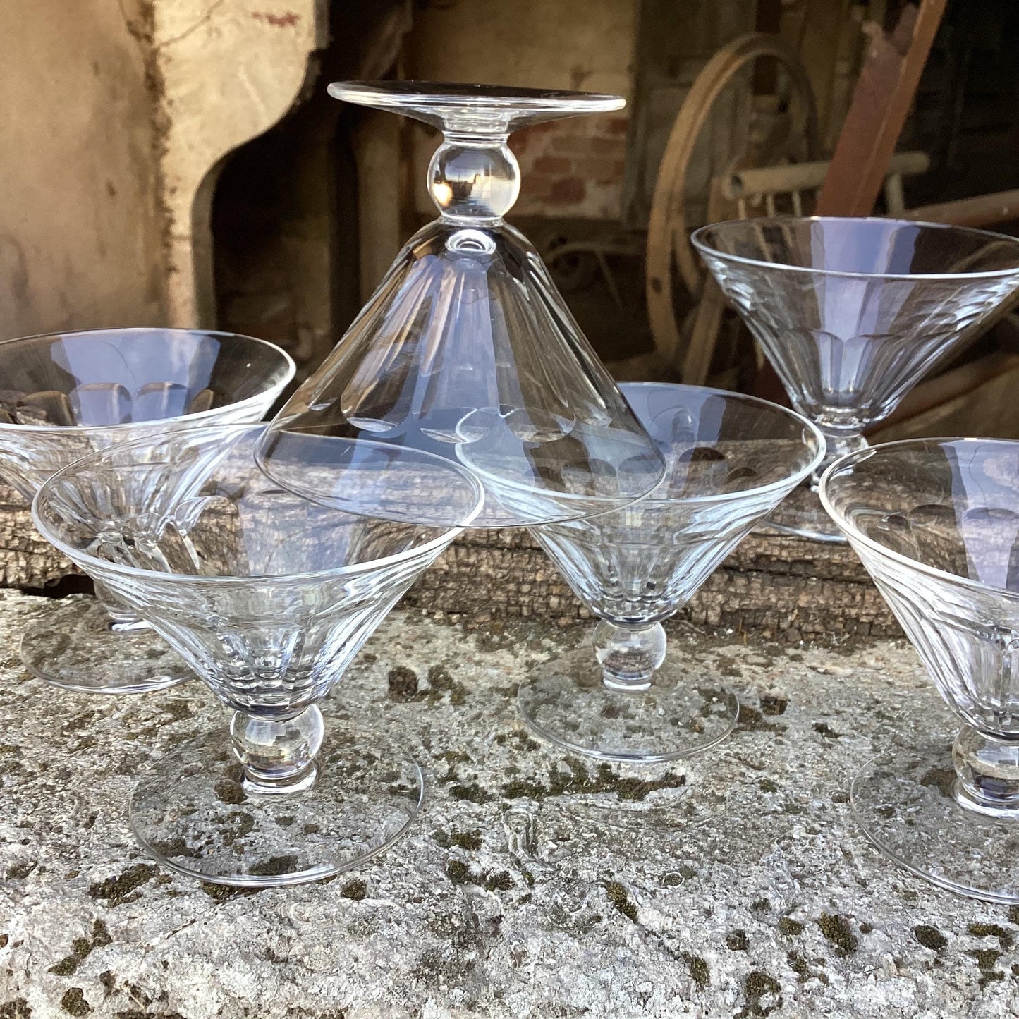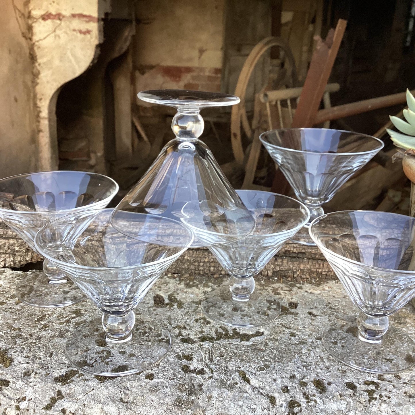 6 Vintage French Crystal Champagne Coupes: artisan blown, cut glass