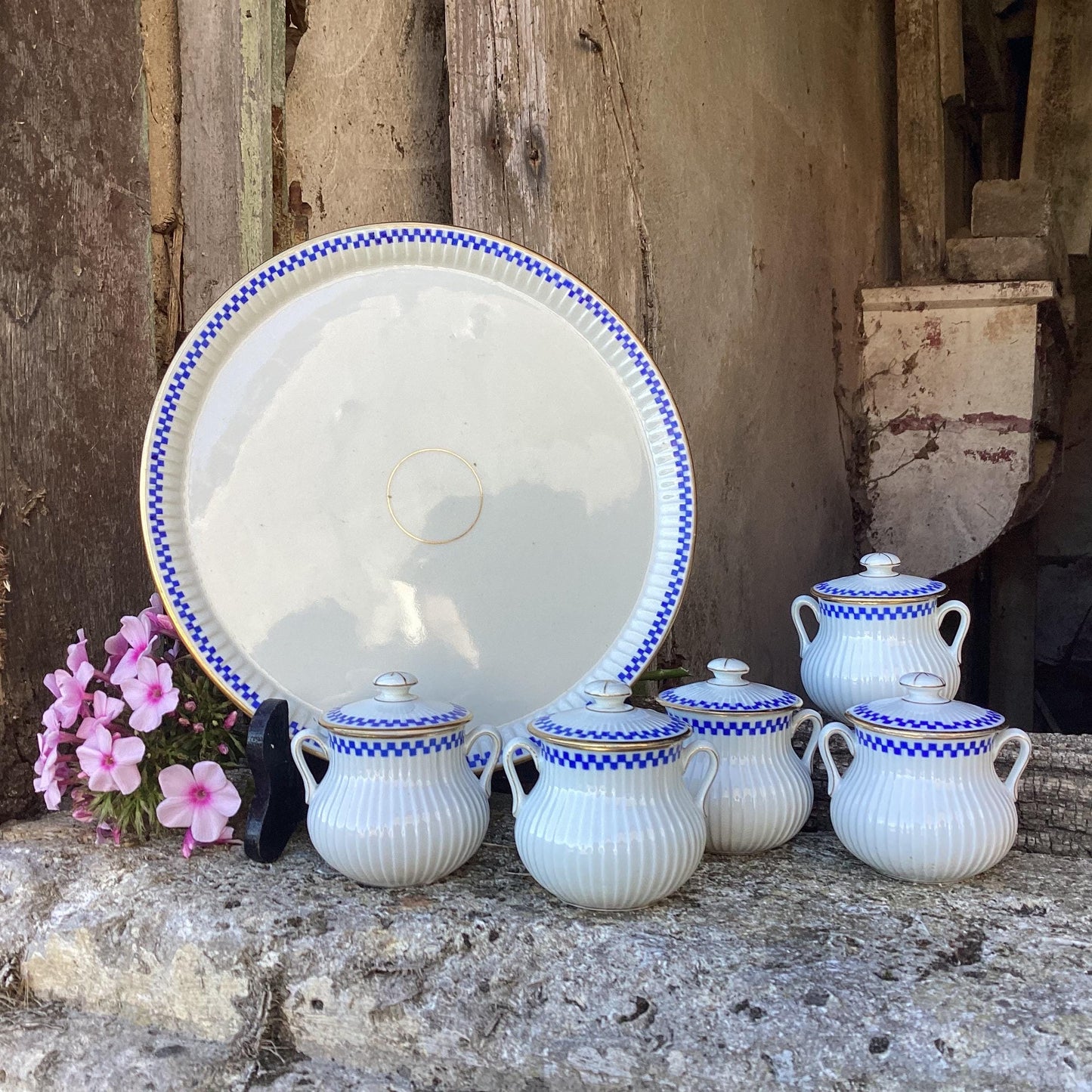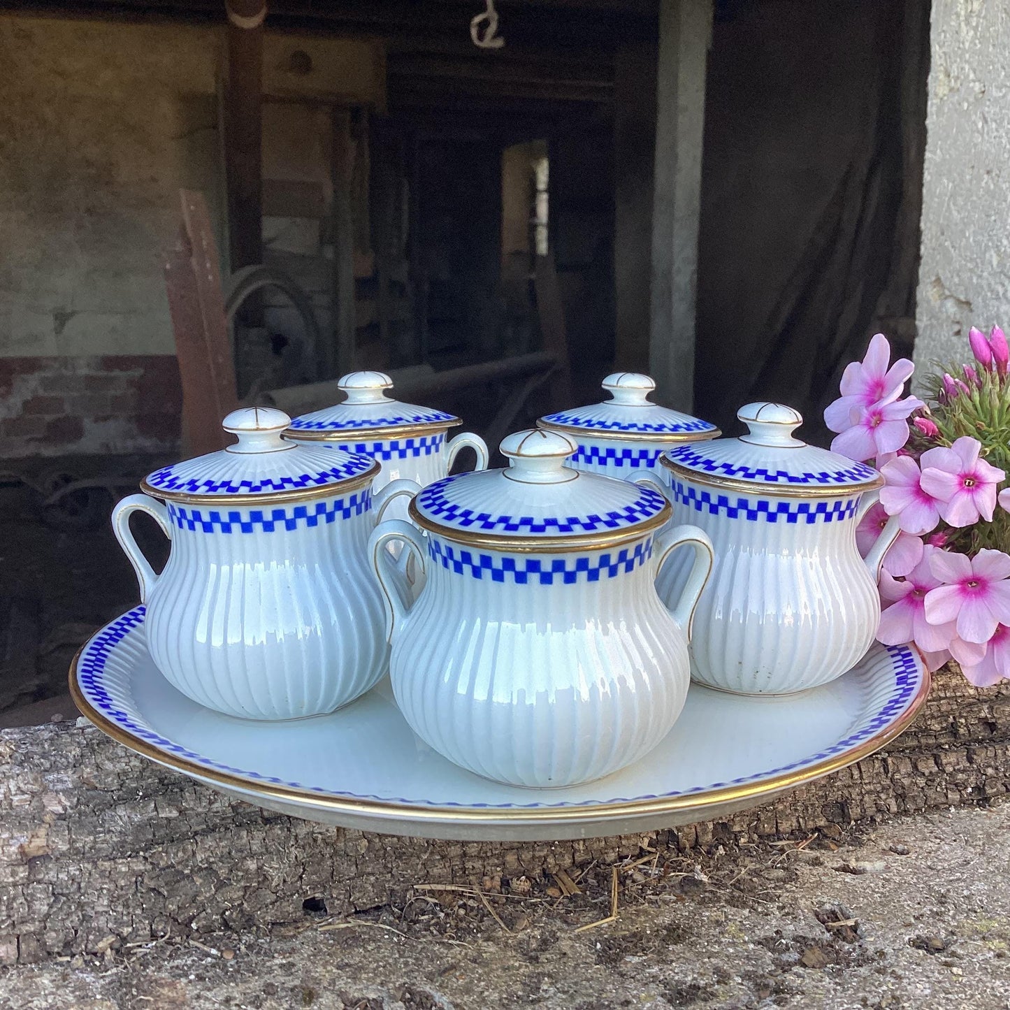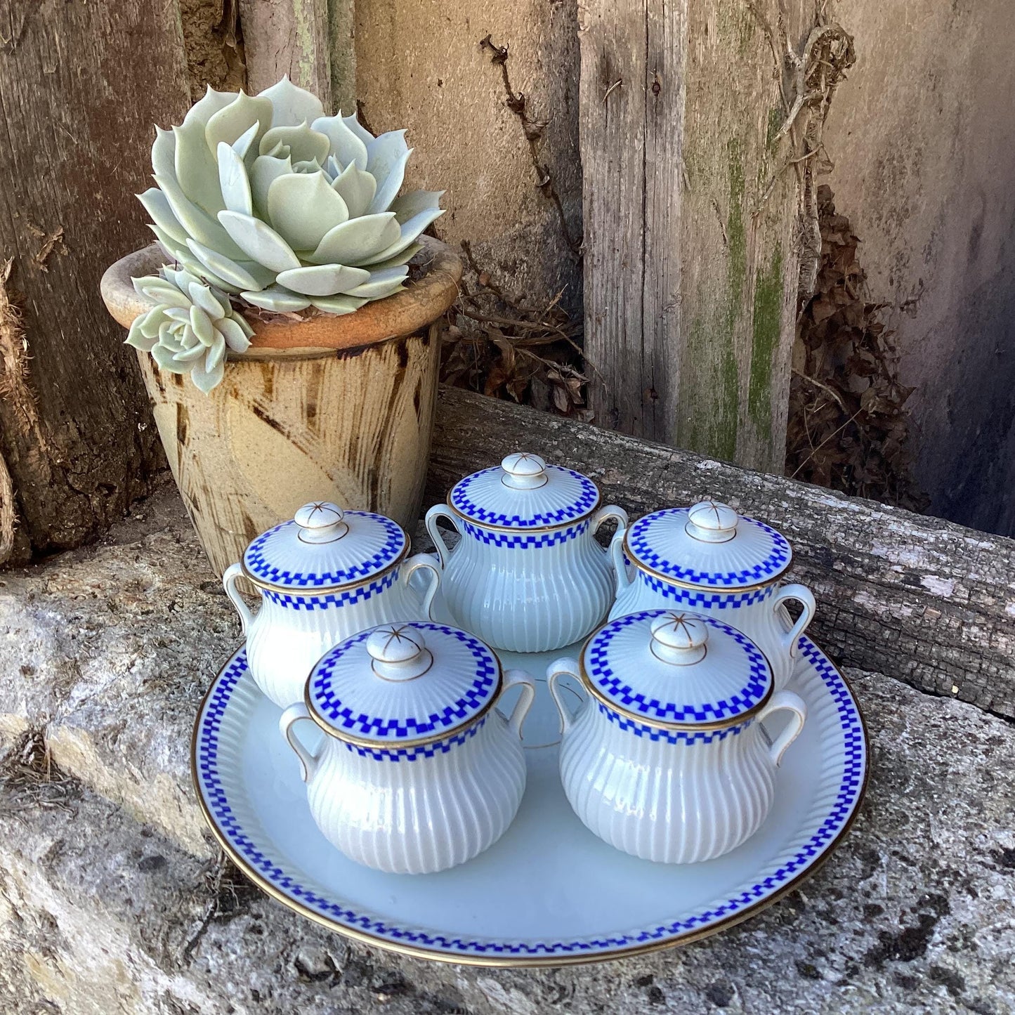 Antique Mehun Porcelain Cream Pots with Serving Dish: Blue & White, Set of 5