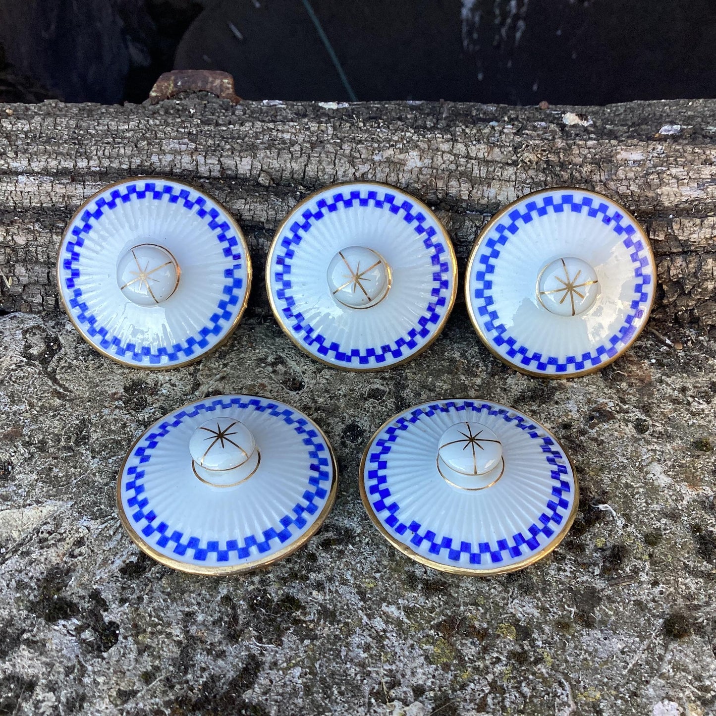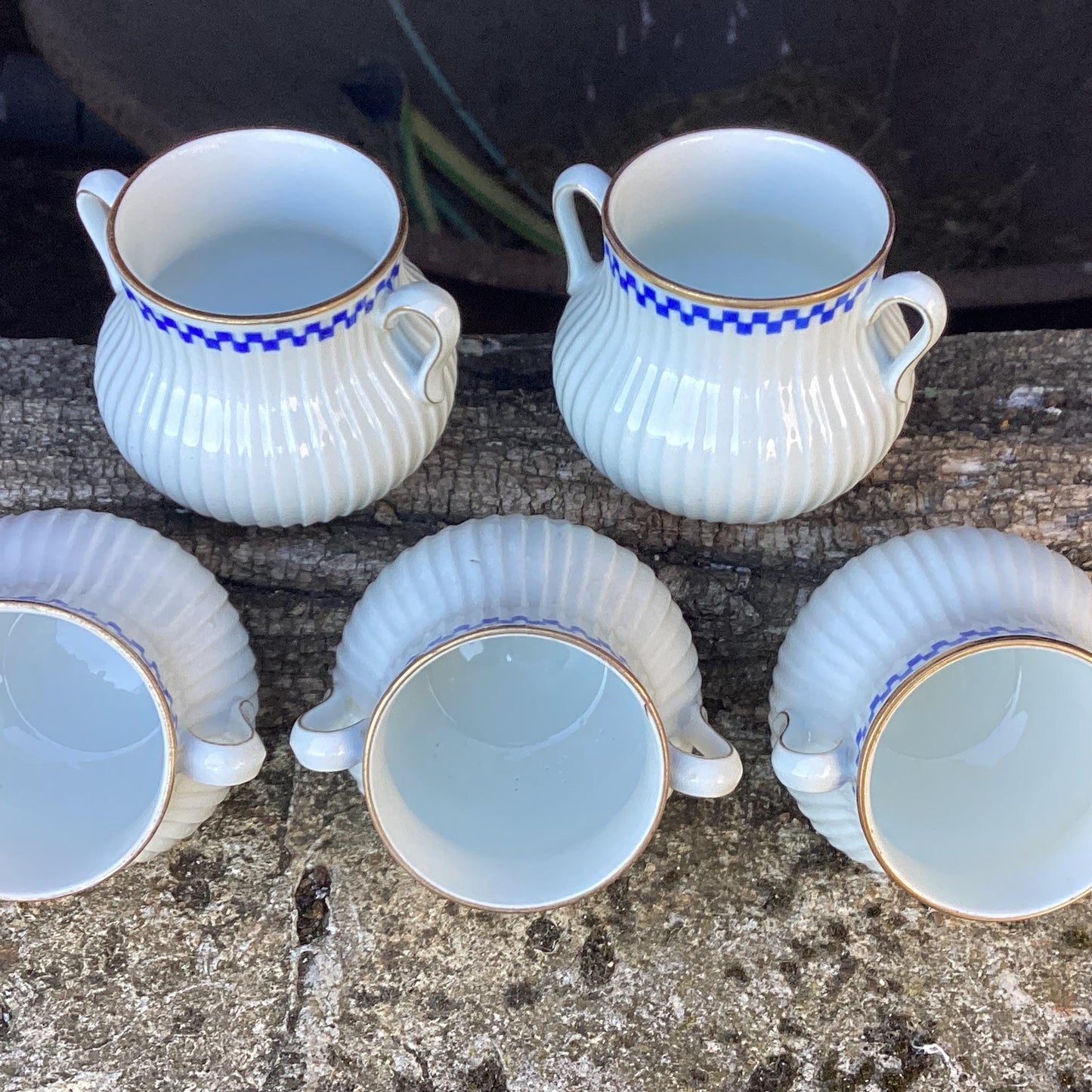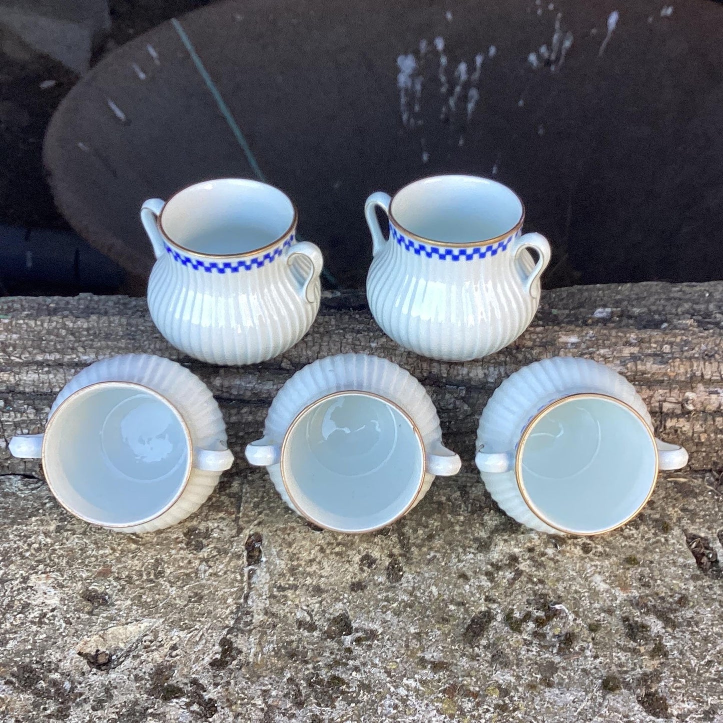 Antique Mehun Porcelain Cream Pots with Serving Dish: Blue & White, Set of 5