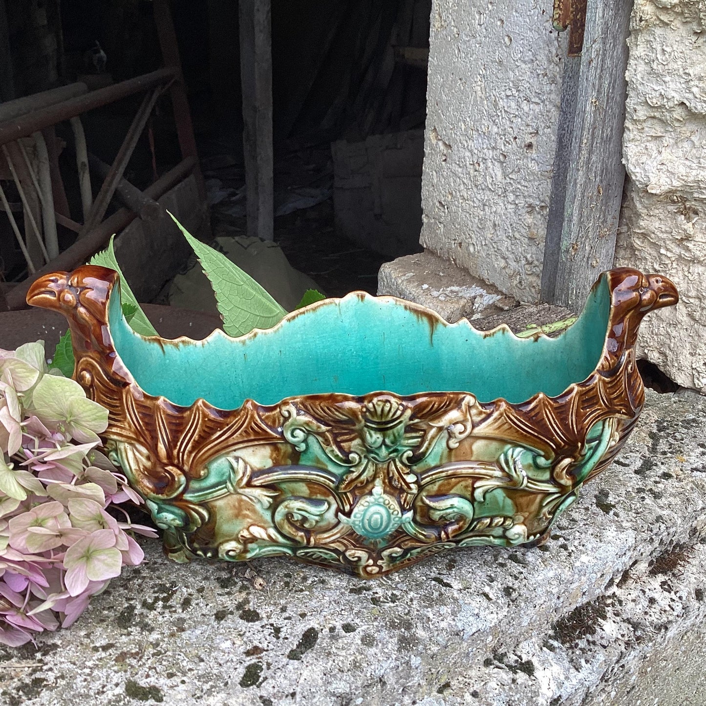 Add 1900s Salins Barbotine Planter : majolica centerpiece, turquoise, brown and green Drakkar to the cart