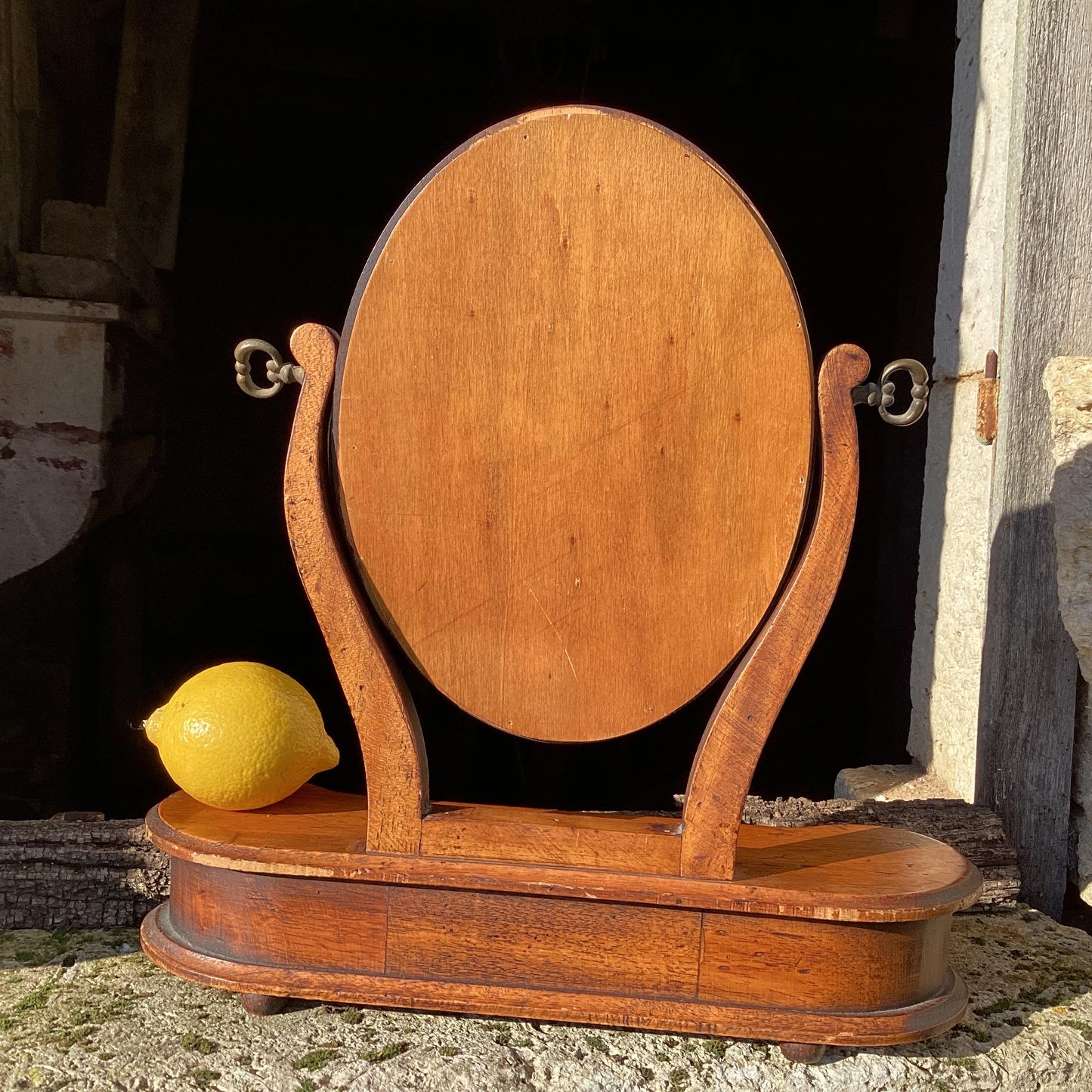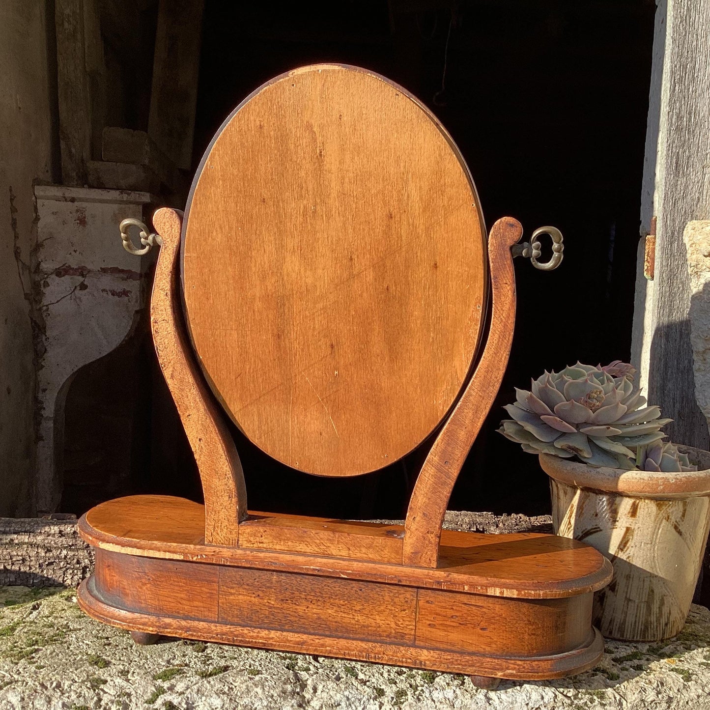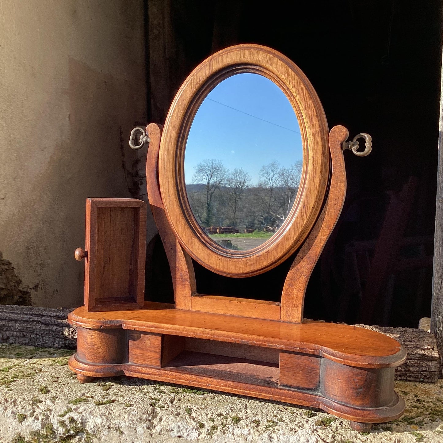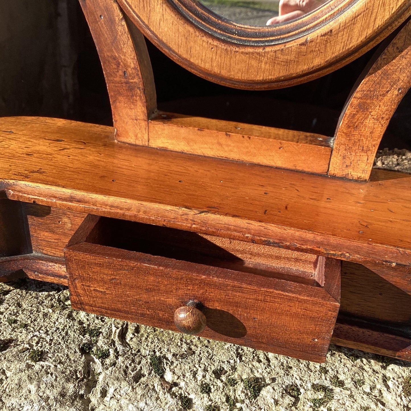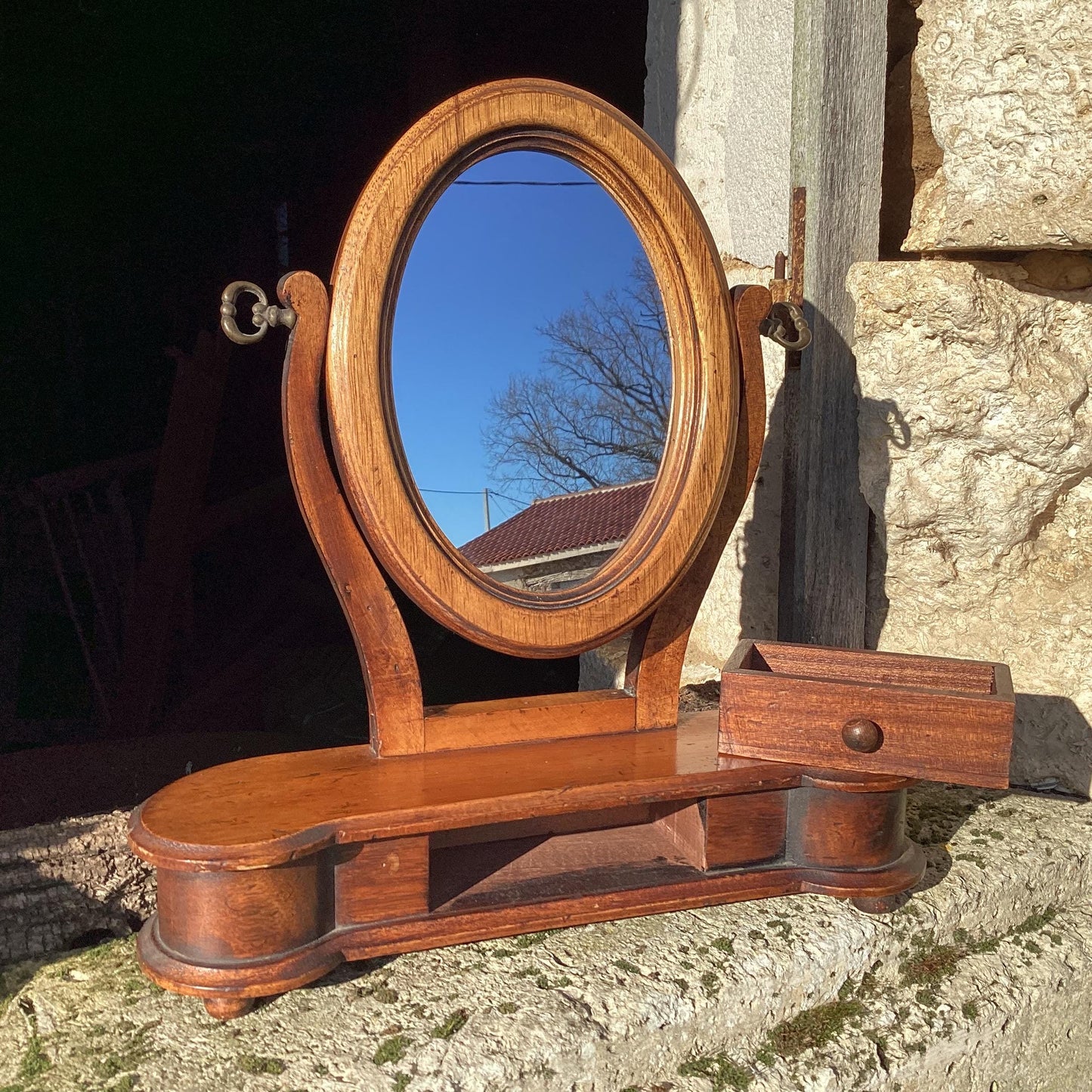 Antique Wood Table Top Mirror : framed mirror with drawer, small Psyché looking glass
