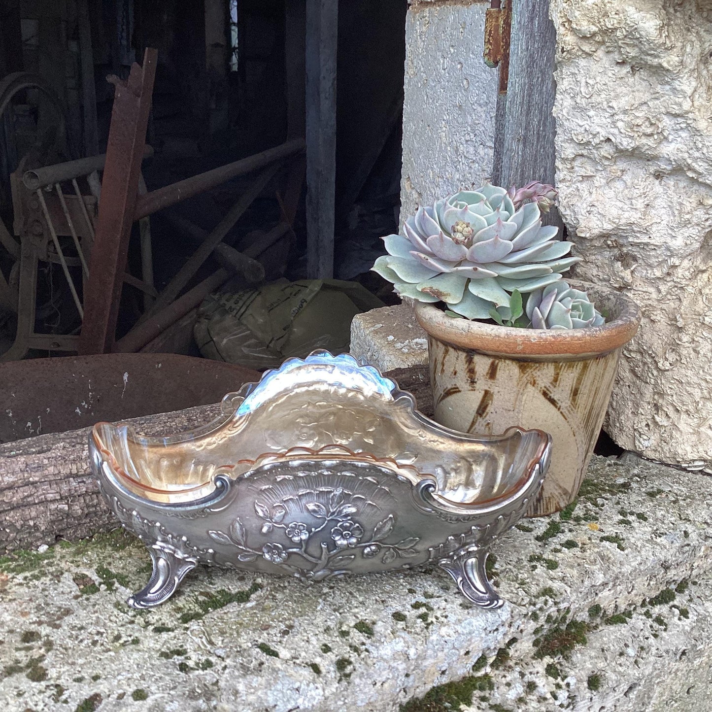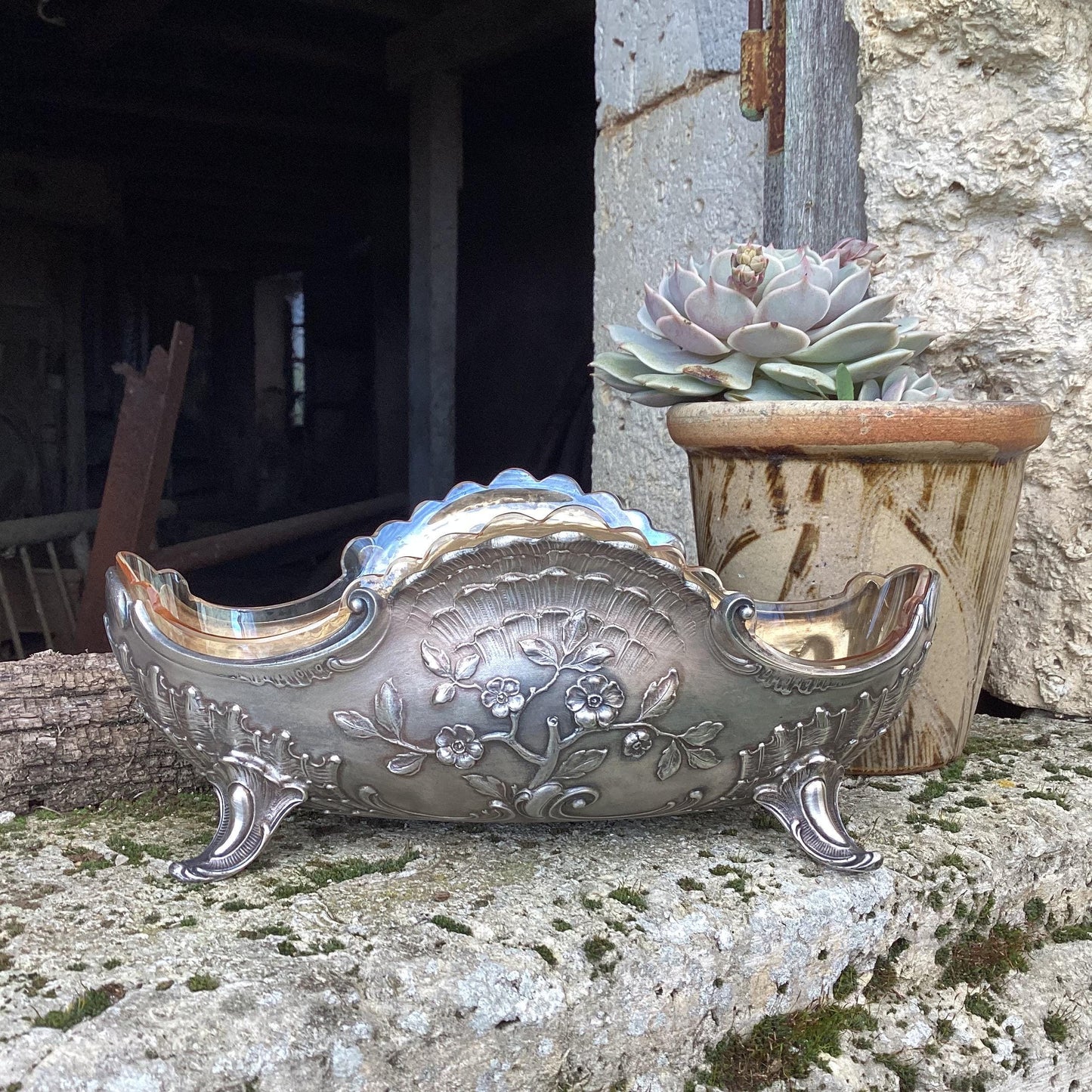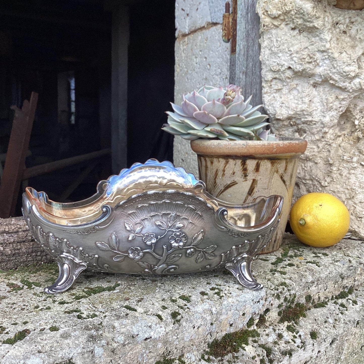 Silver metal planter complete with glass interior : a centerpiece