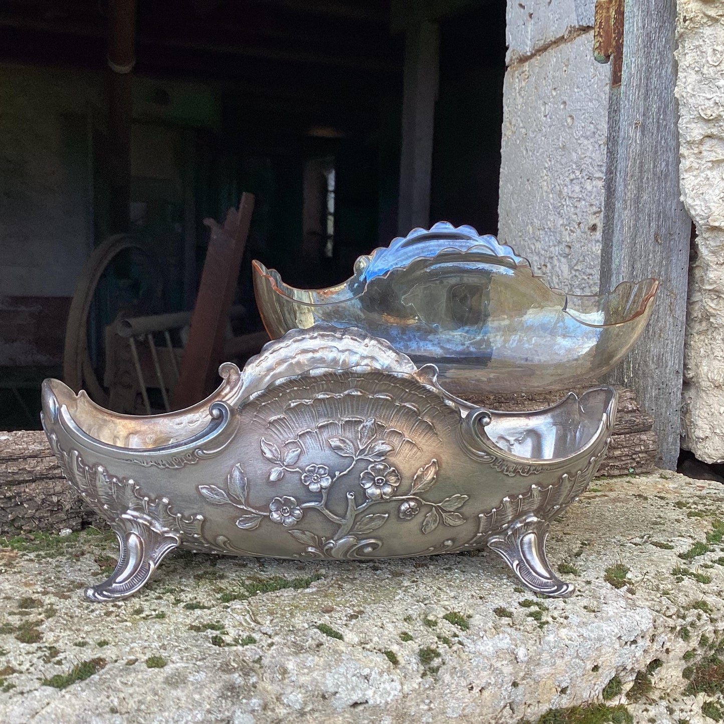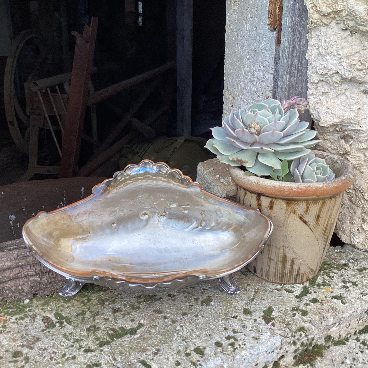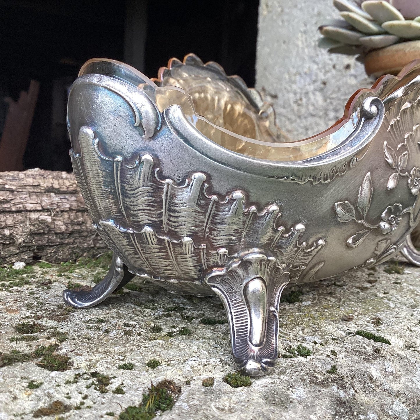 Silver metal planter complete with glass interior : a centerpiece