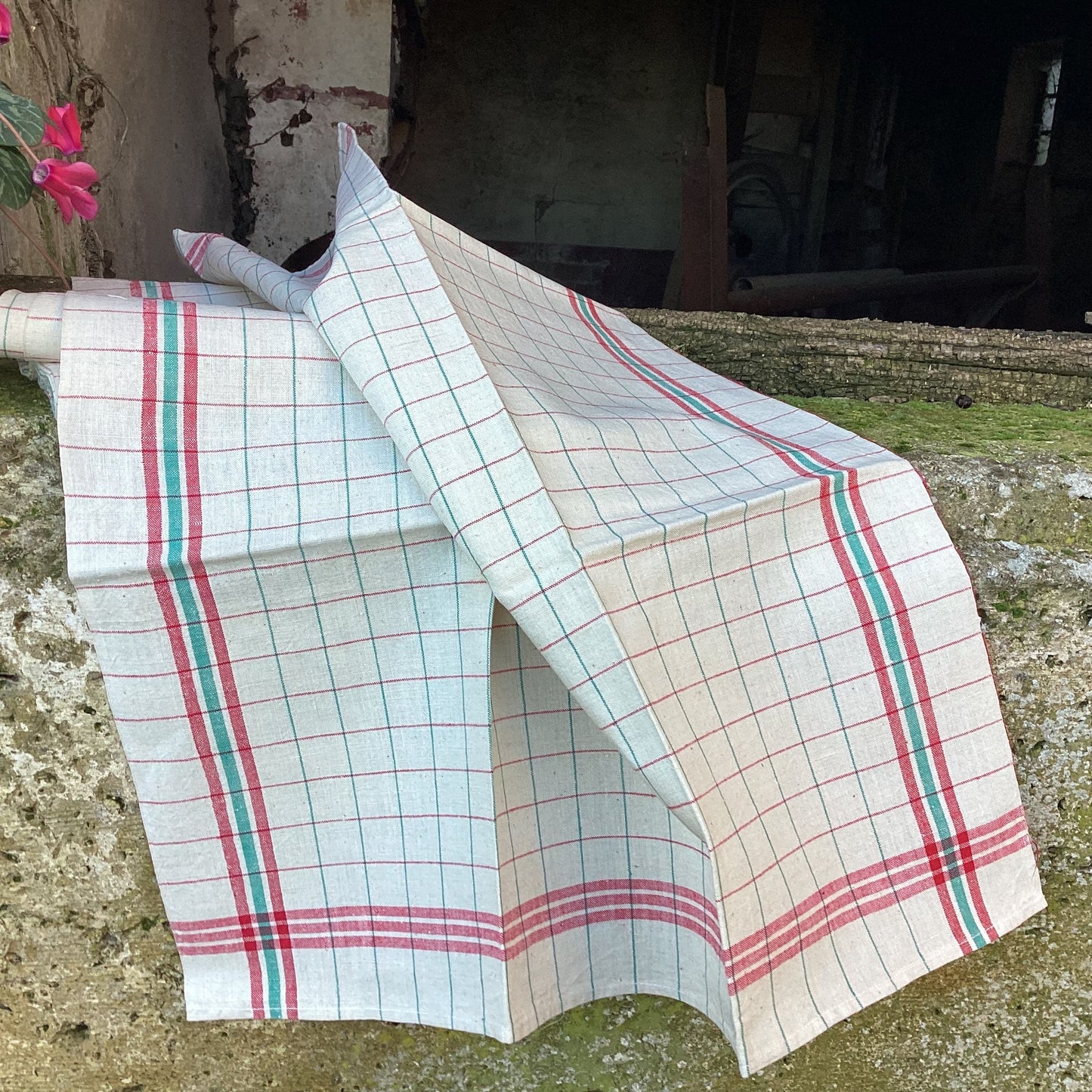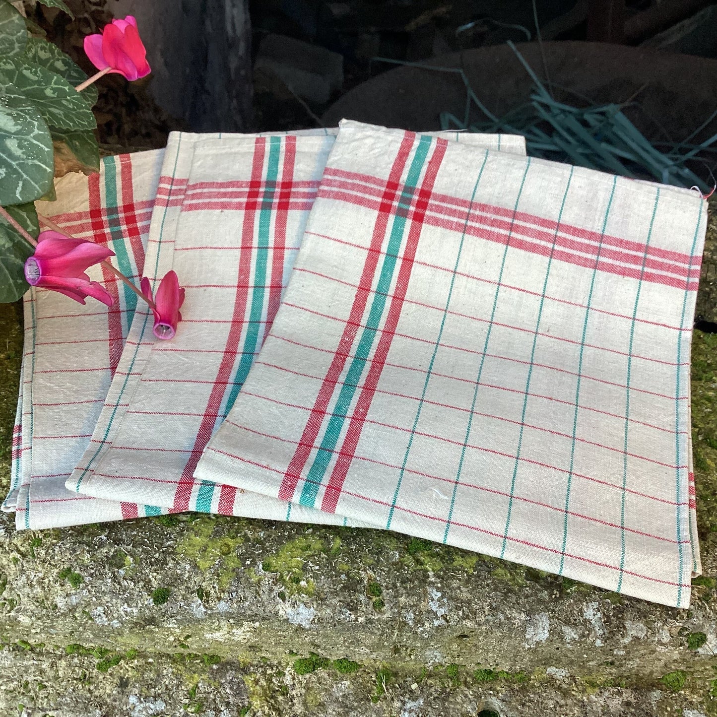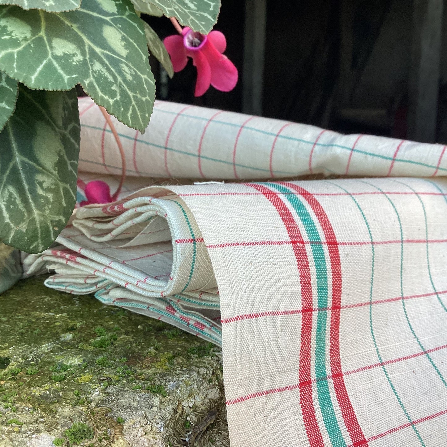 French Linen Tea Towels: Vintage Red & Green Striped Kitchen Decor