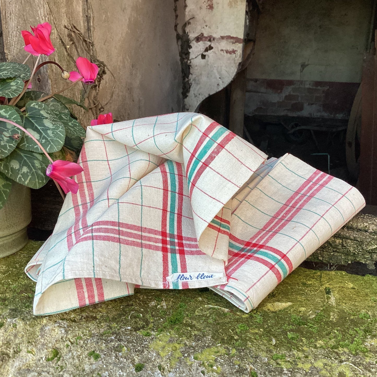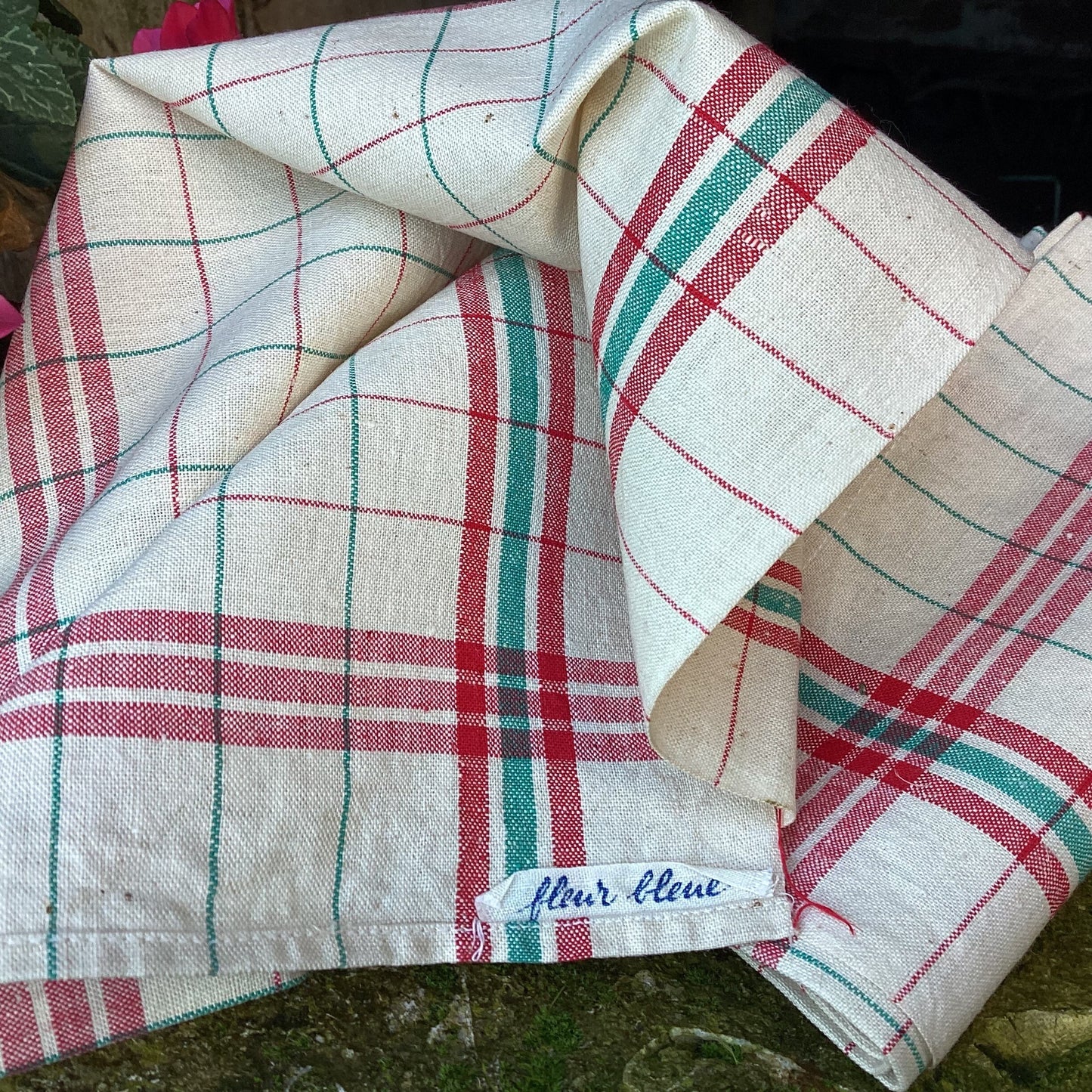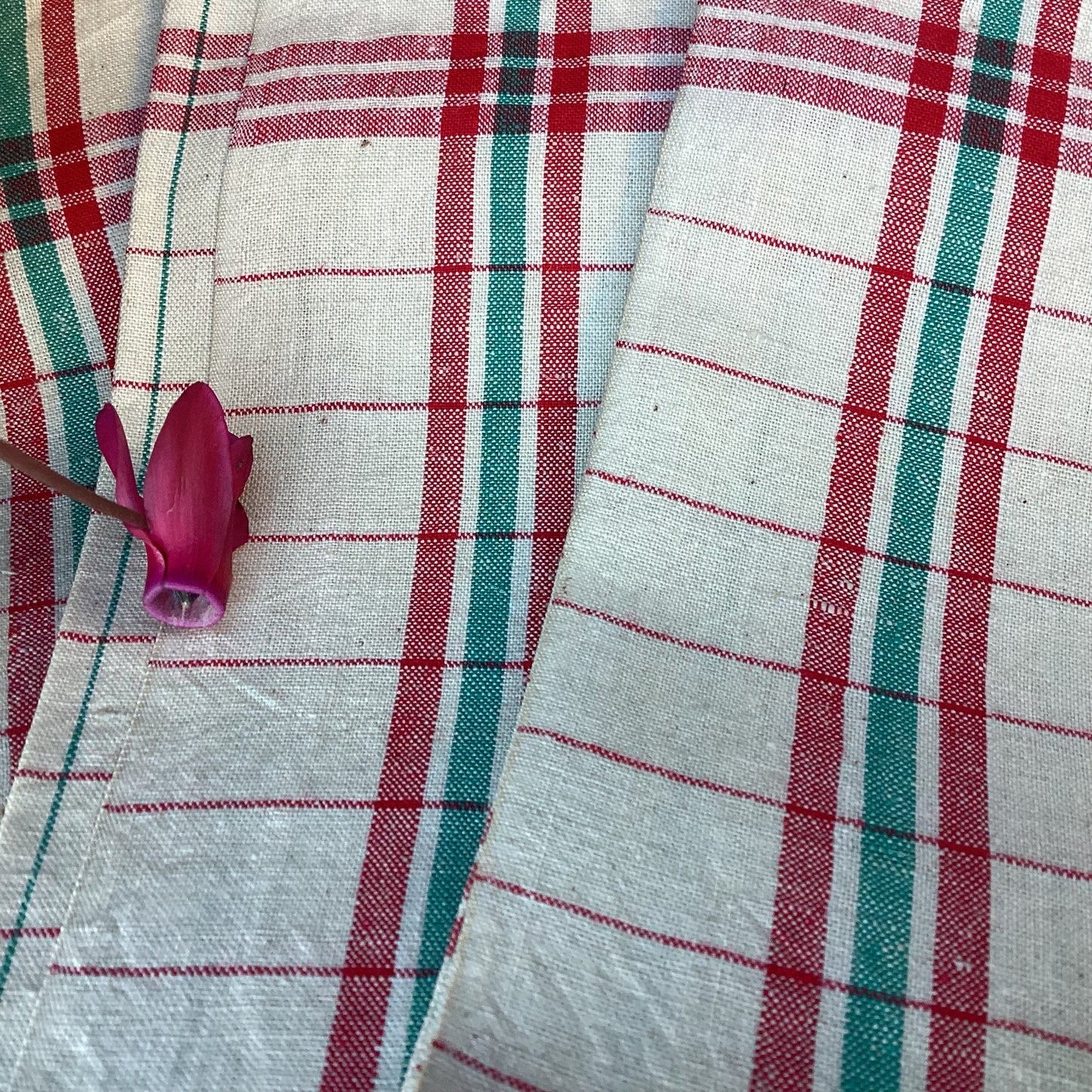 French Linen Tea Towels: Vintage Red & Green Striped Kitchen Decor