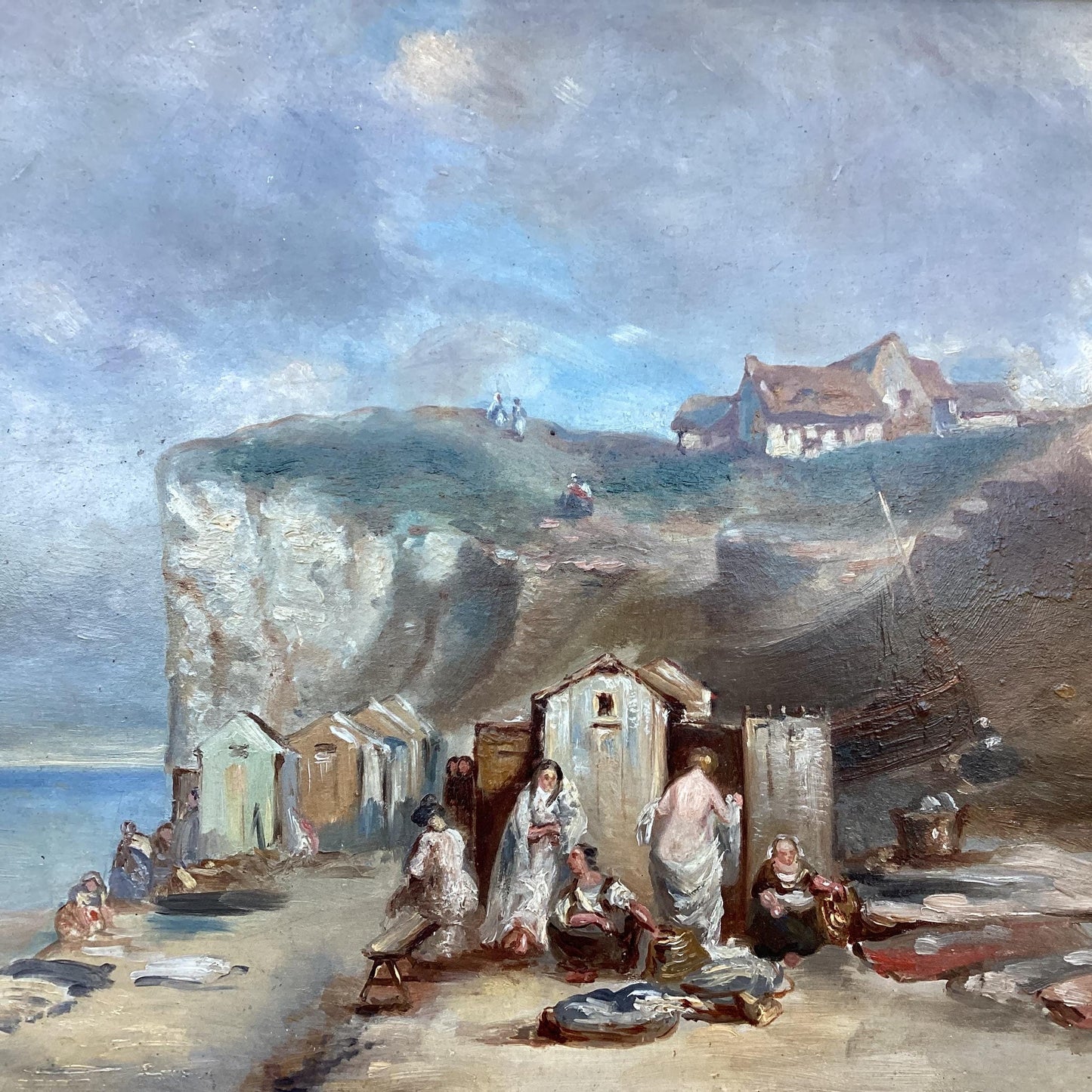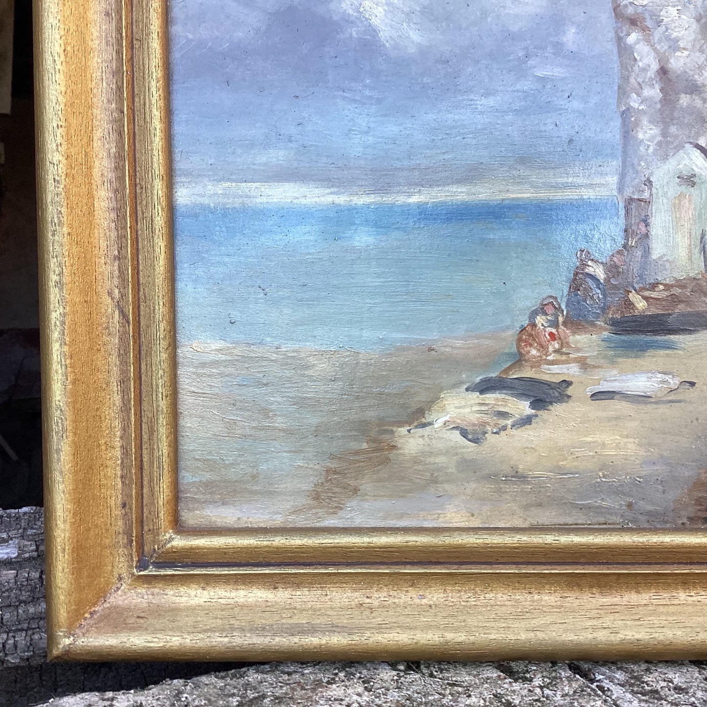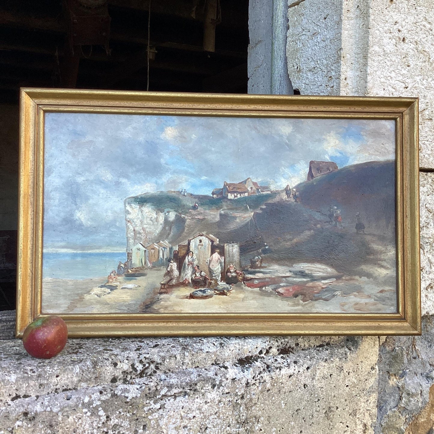 Vintage Maritime Oil Painting, Animated Sea Bathing Scene, Framed