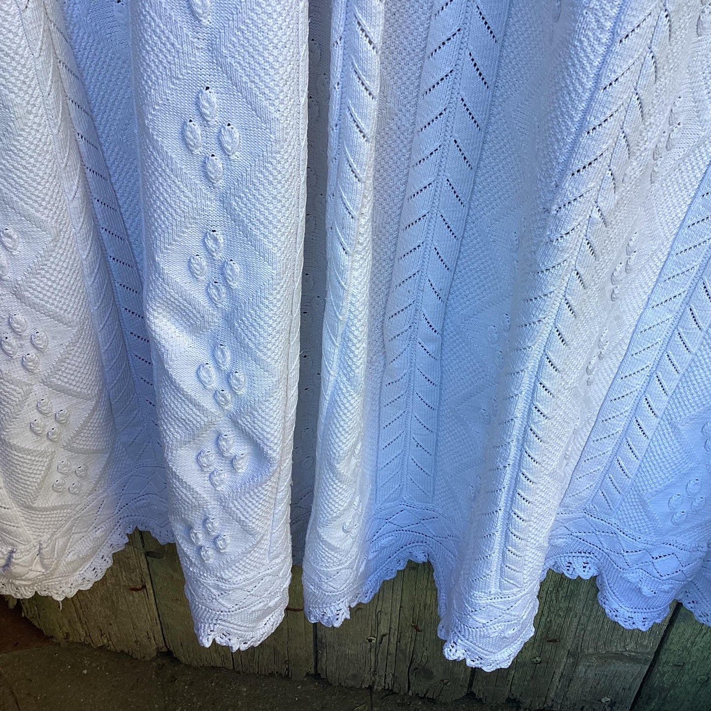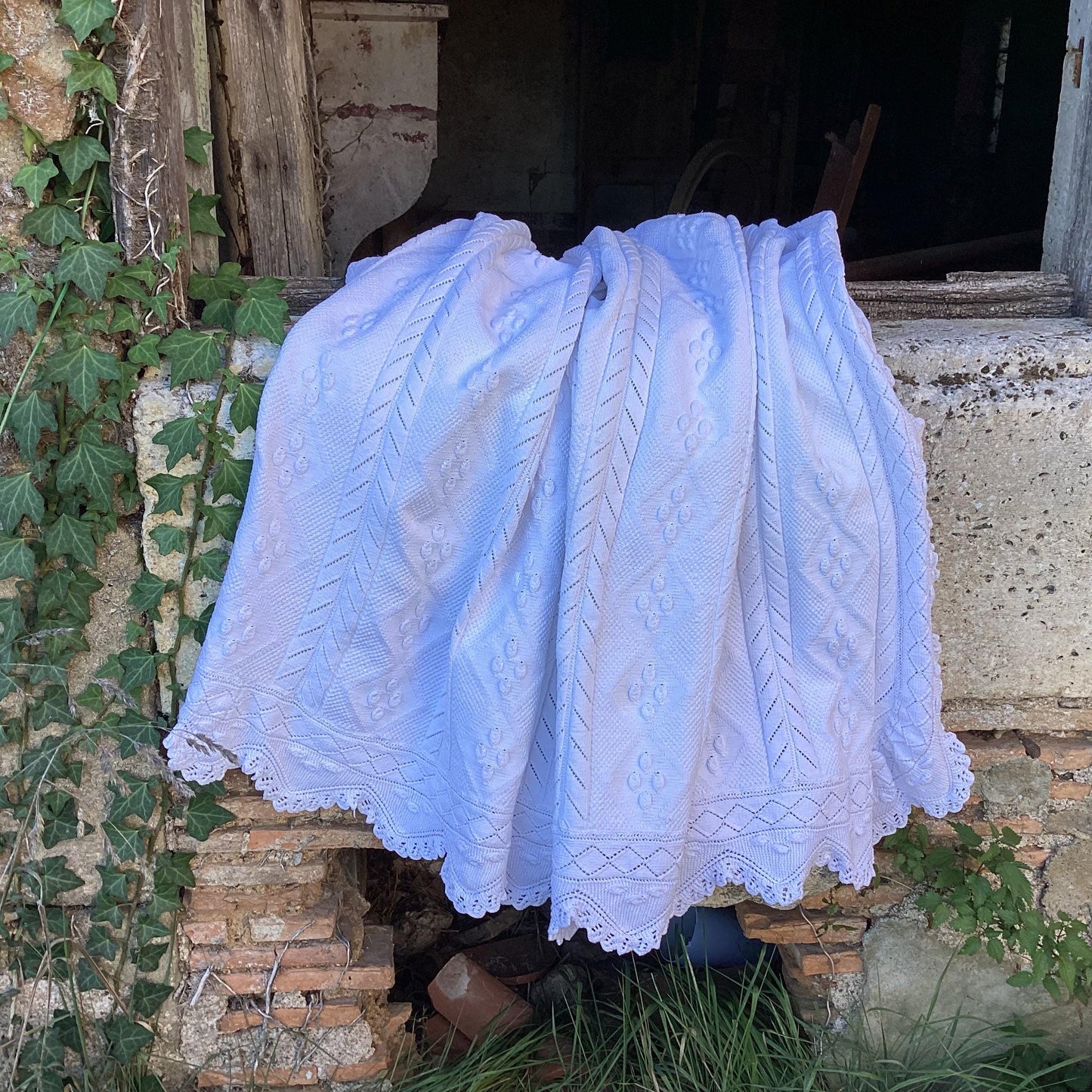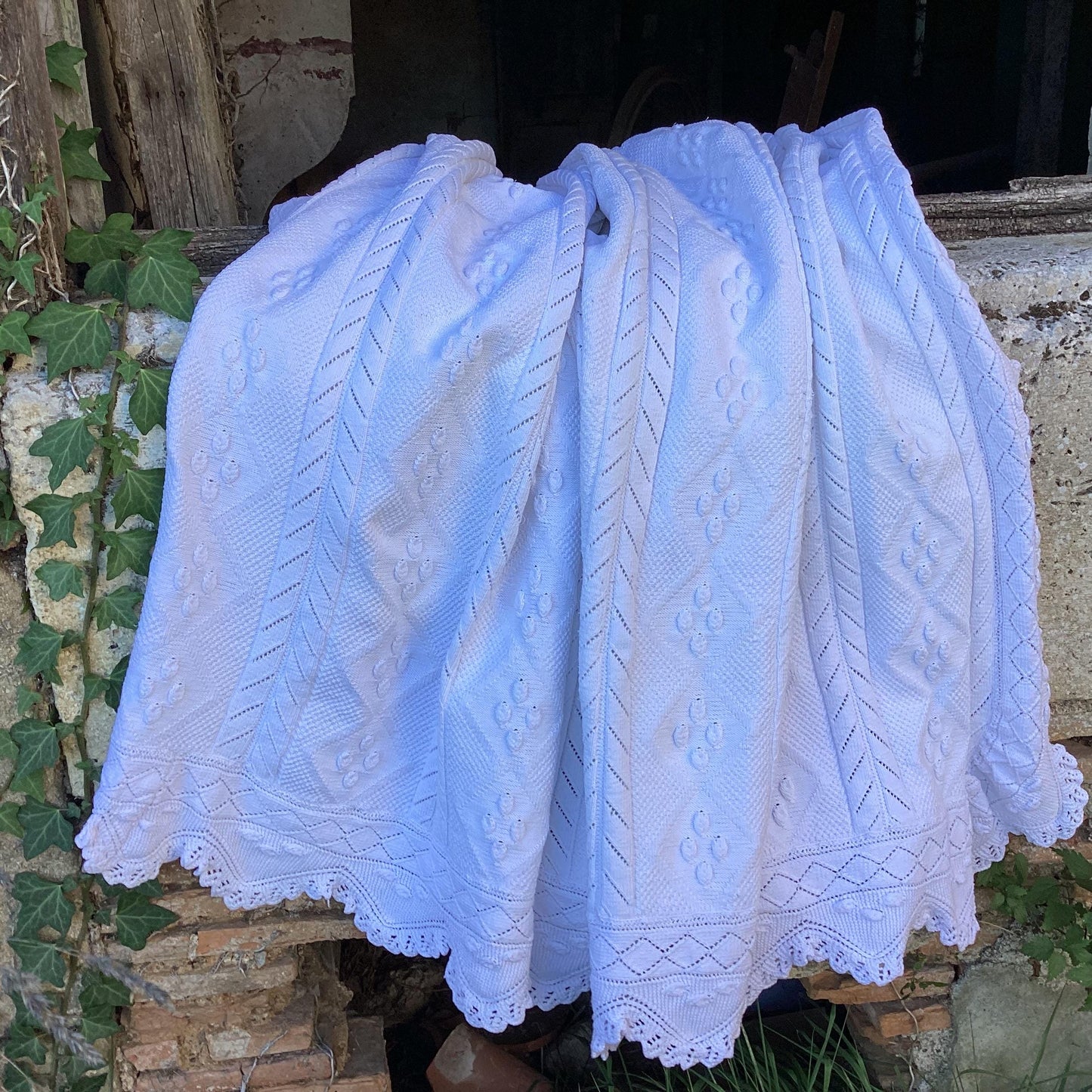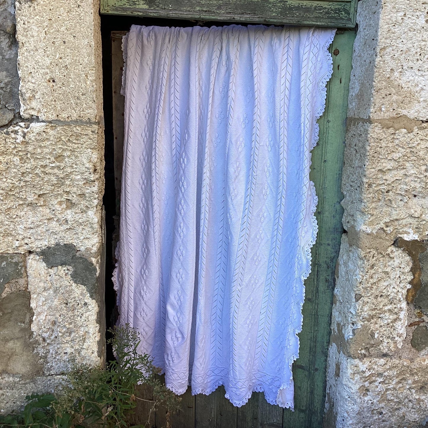 French vintage cotton bed cover : white throw, hand knitted bed spread
